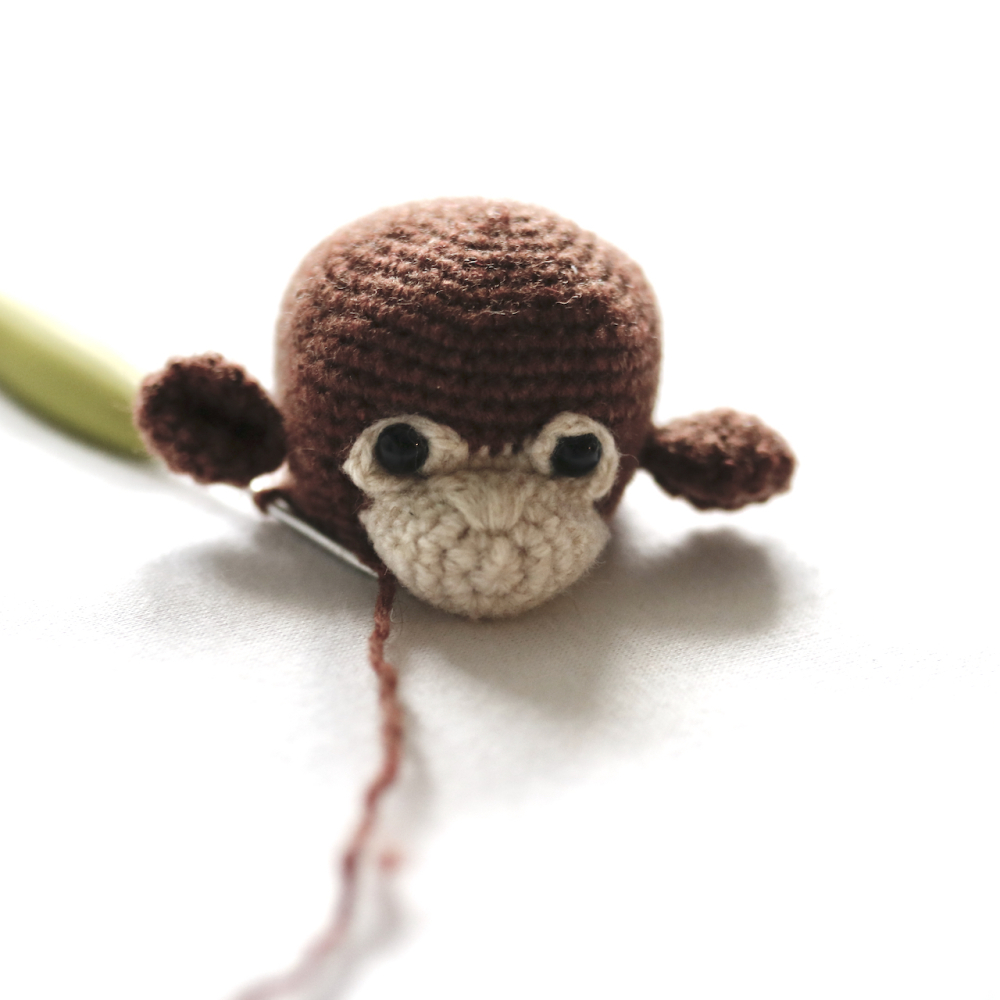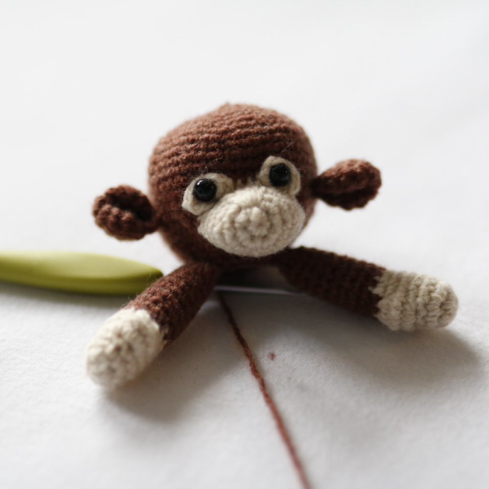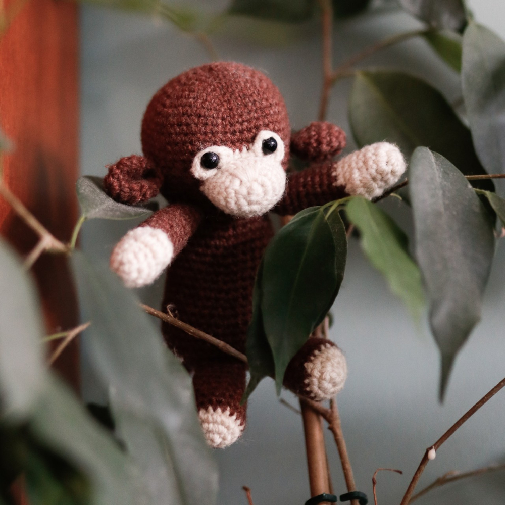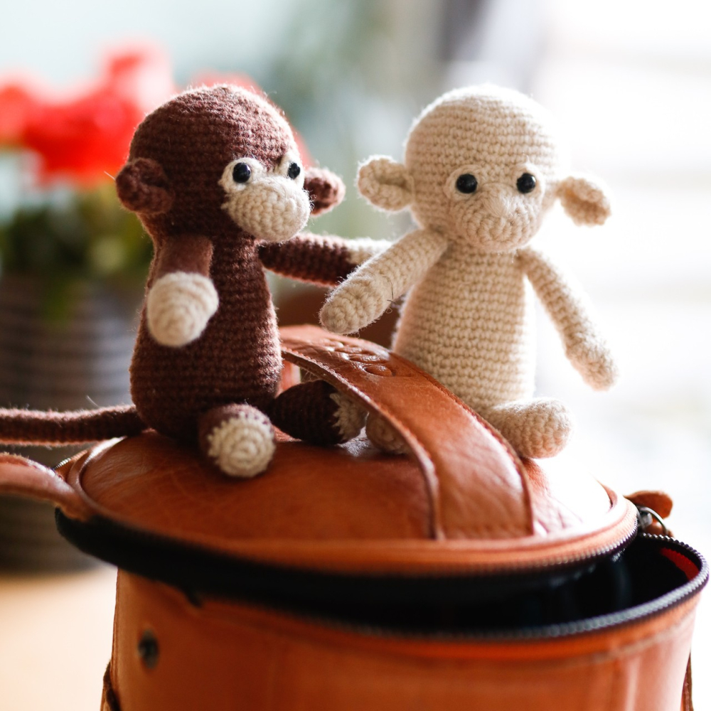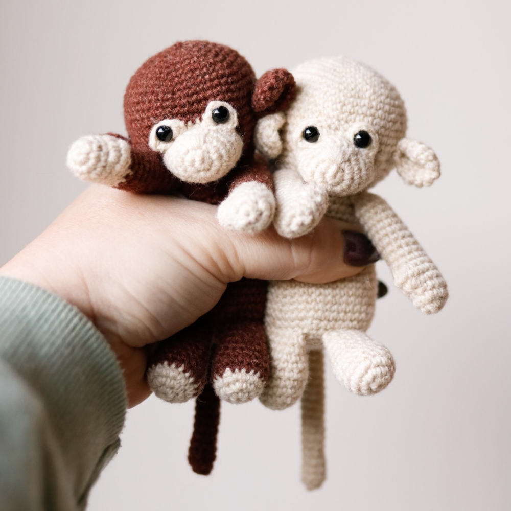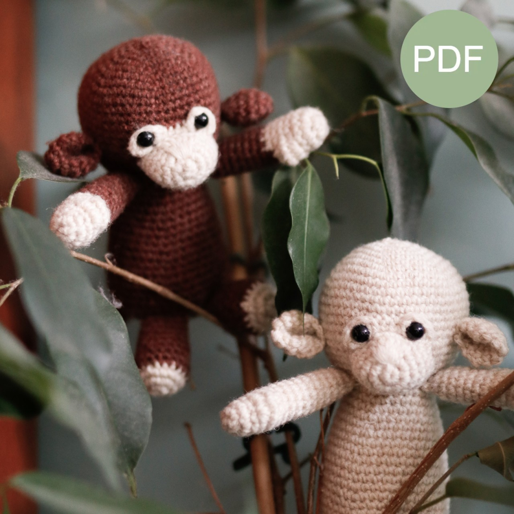 - Voor een aapje (±11cm): Garen voor nld 2,5-3mm. Ik gebruikte Scheepjes Metropolis in bruin #062 Valencia en creme #078 Lyon