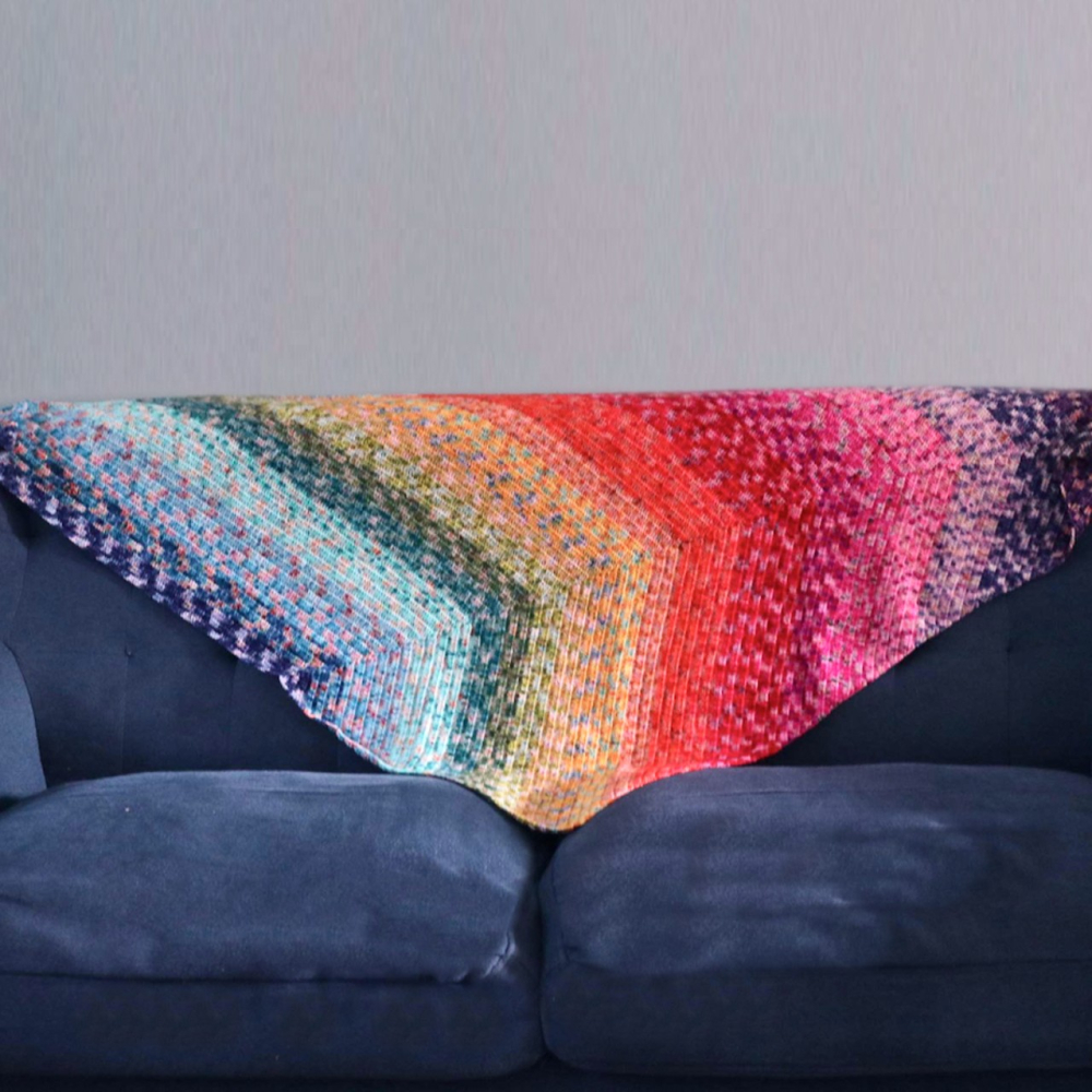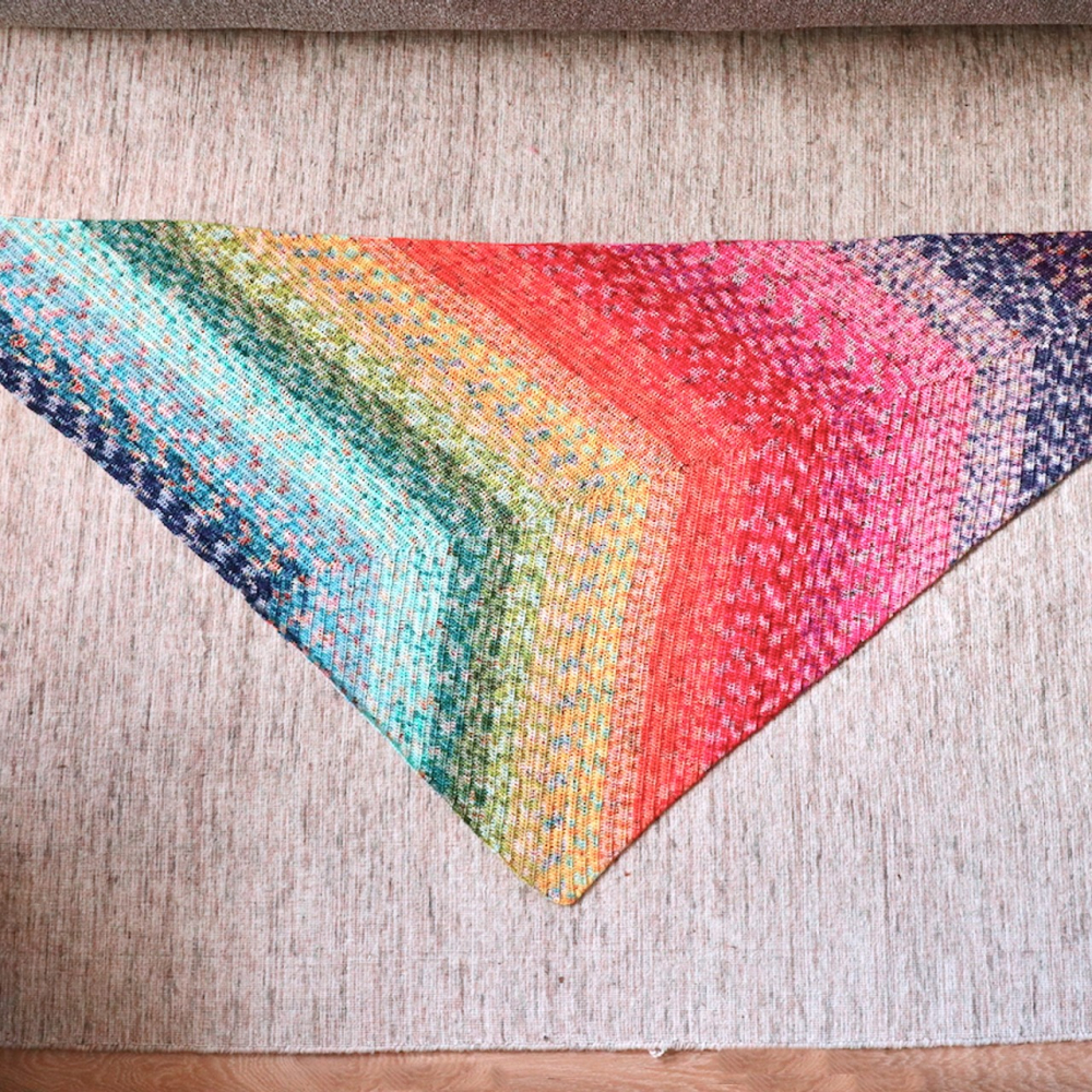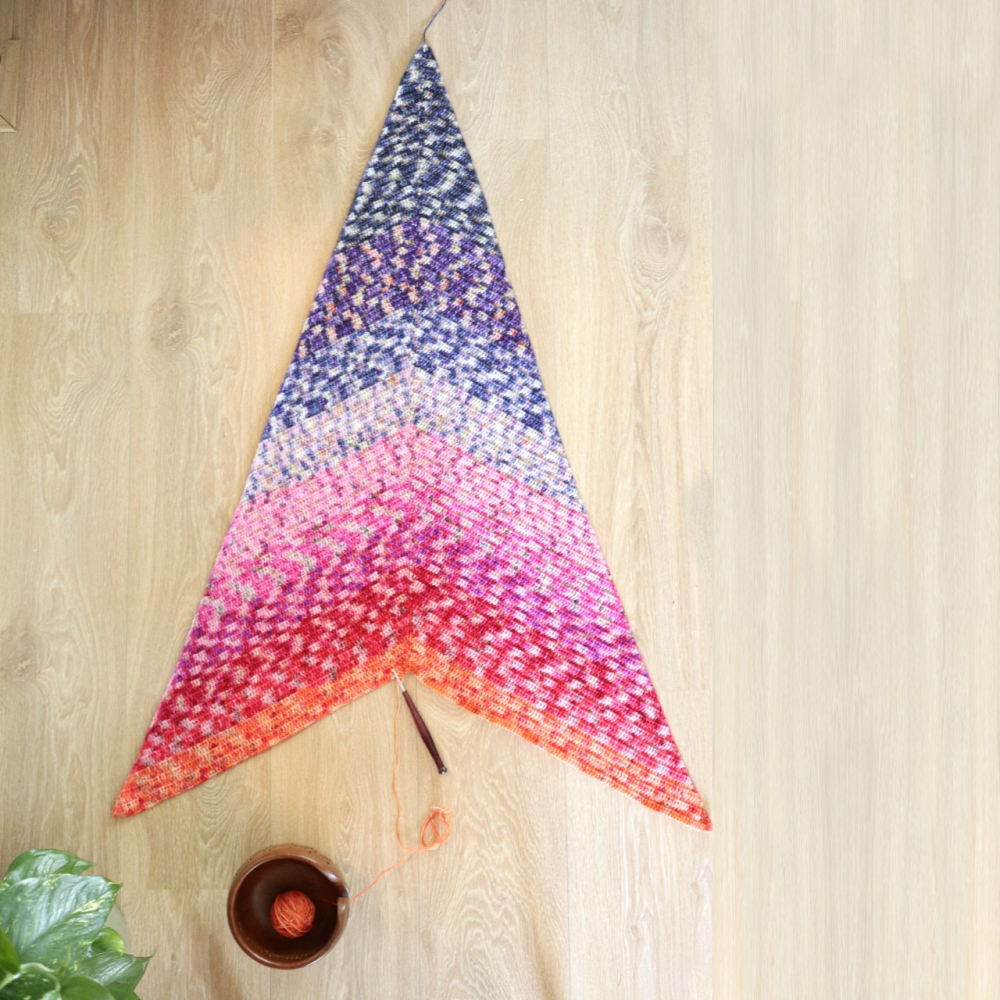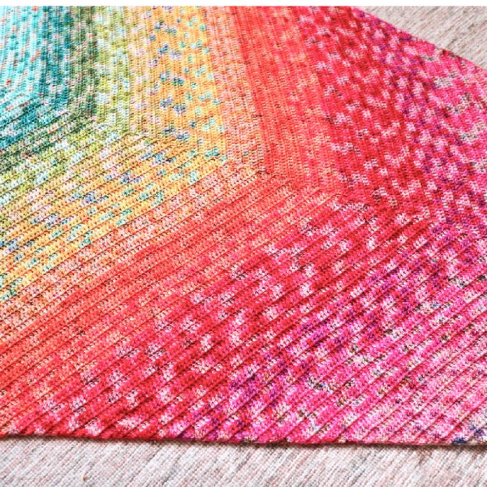 Deze bijzondere sjaal heeft een klassiek driehoekig model, maar met een bijzonder twist. Doordat je deze sjaal in de breedte haakt ontstaan er twee verschillende lijnen die de omslagdoek een bijzonder uiterlijk geven.