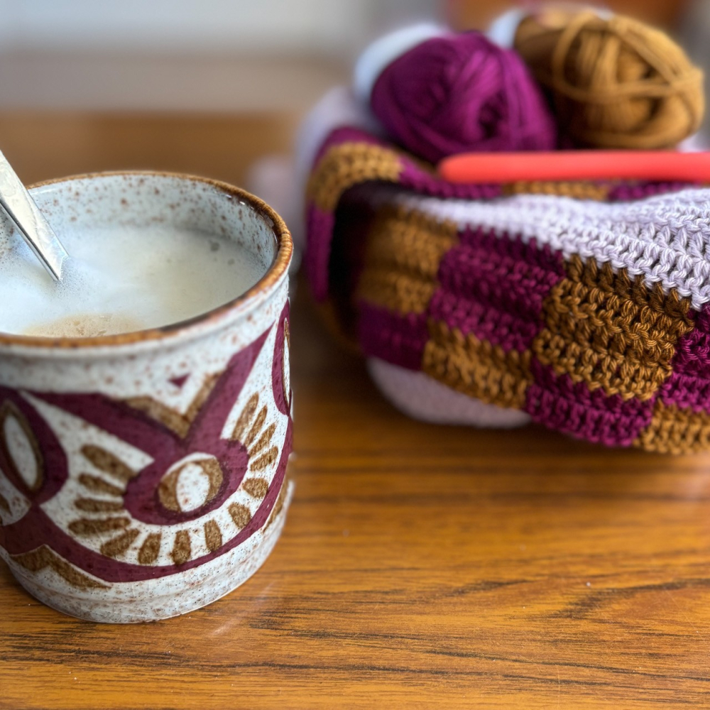 - Garen voor nld 2,5 - 3 mm, ik gebruikte 7 bollen Scheepjes Organicon (170 m/ 50 g), 3 x basiskleur: 204 Lavender Haze, 2 x kleur 2: 236 Mellow Mustard en 2 x kleur 3: 246 Dahlia.