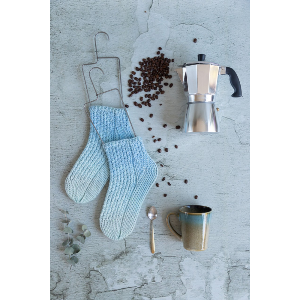 Het stekenpatroon van deze sokken is gebasseerd op de gebreide 'koffieboontjes-steek'.
