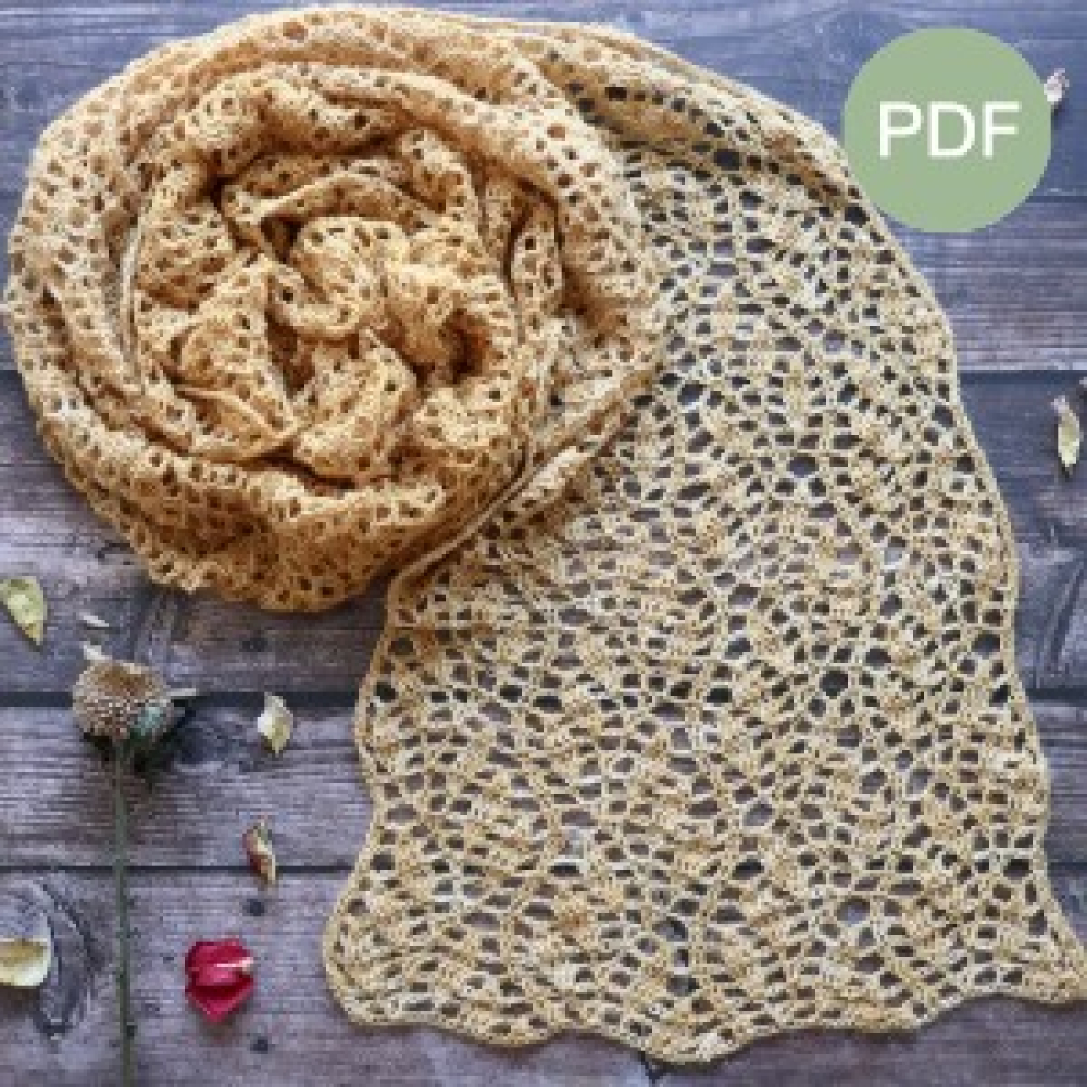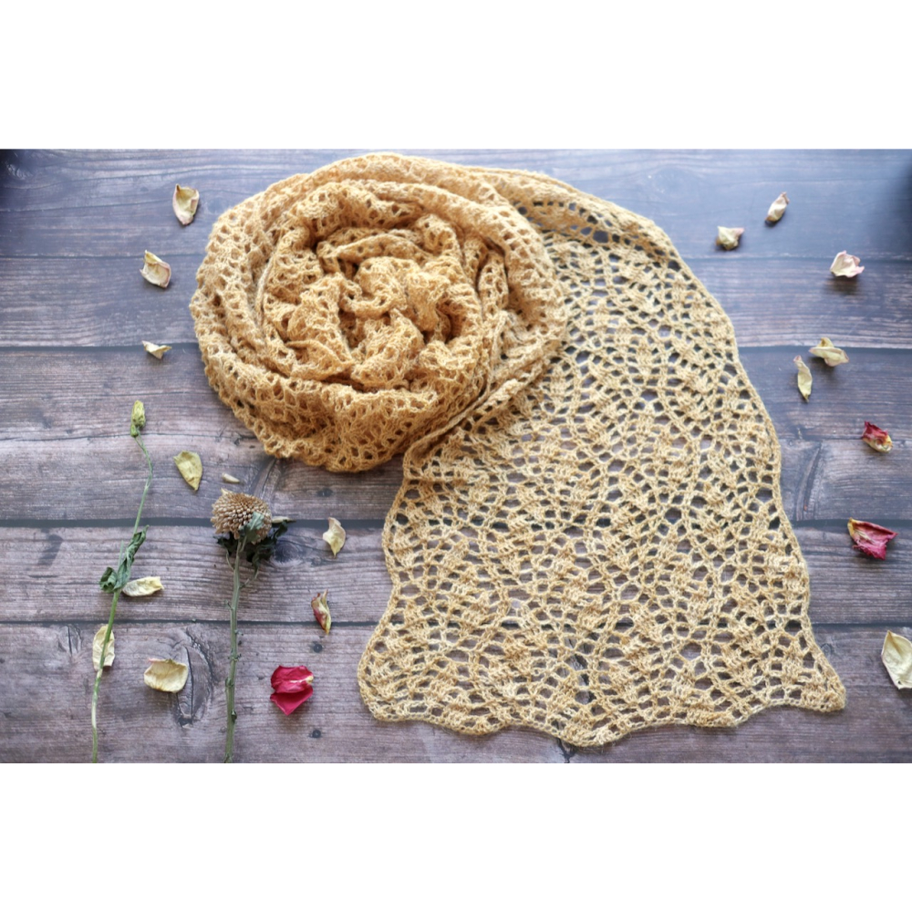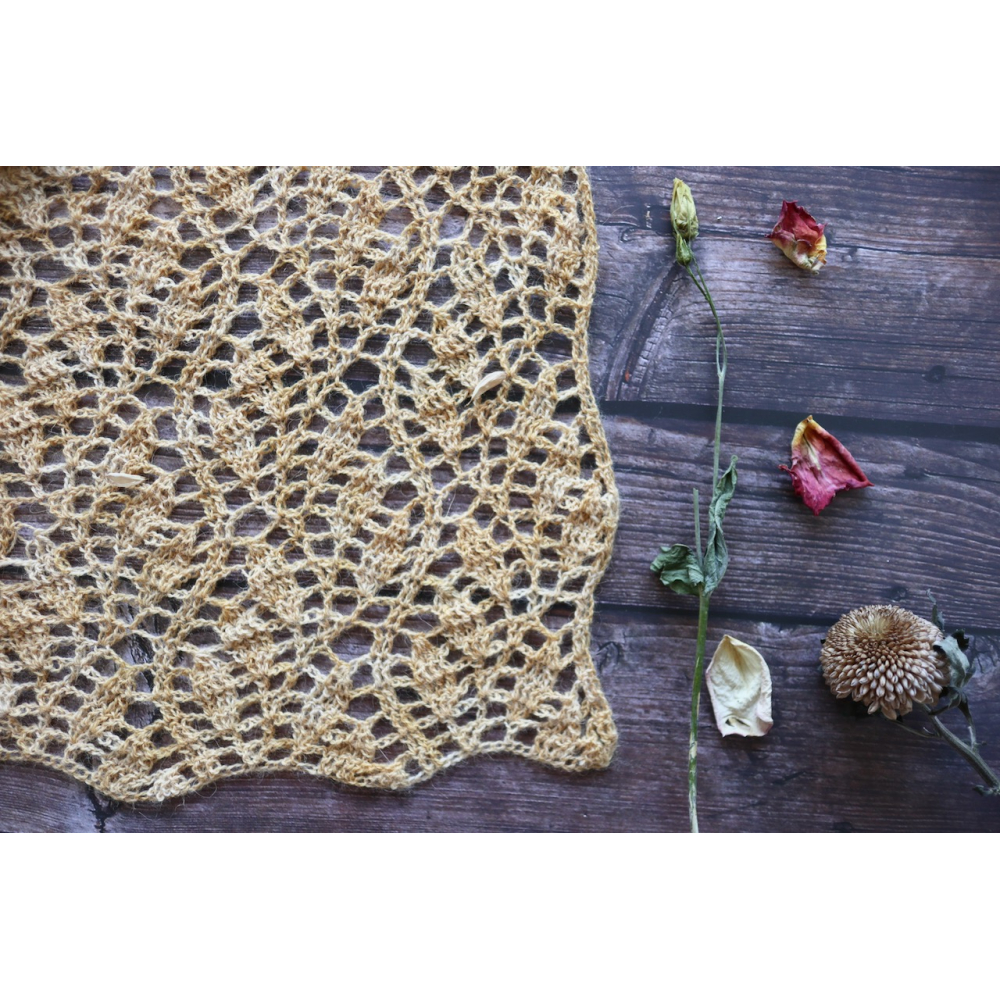 Het is een rechthoekige sjaal met een prachtig stekenpatroon van ontluikende bloemknopjes.
