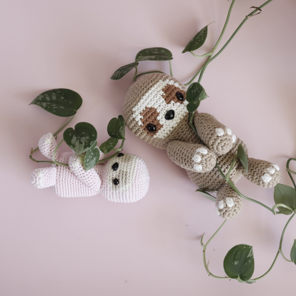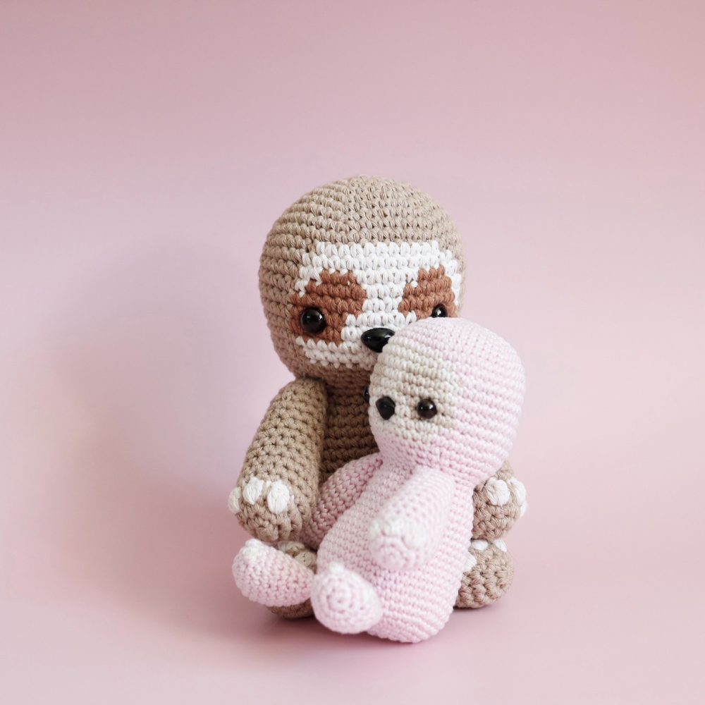 - Voor een grote luiaard (±18cm): Garen voor nld 3,5-4,5mm. Ik gebruikte Borgo de Pazzi Amore cotton 170 (1 bol van 170m/100g is genoeg voor elke kleur) in: beige #103, wit #101 en bruin #137