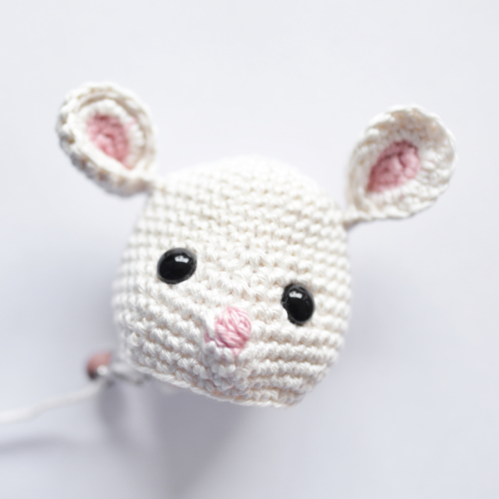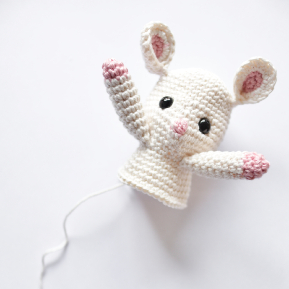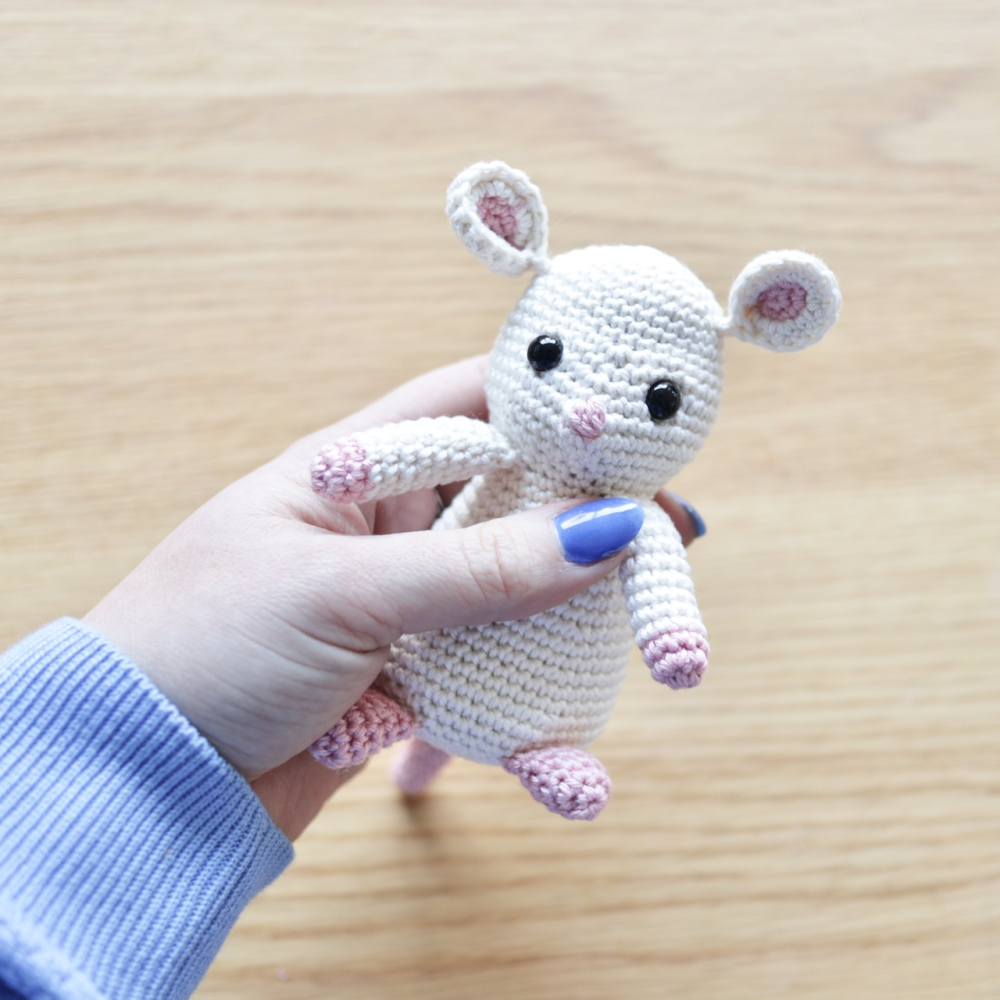 - Voor de grote muis (±18cm): Garen voor nld 3,5-4,5mm. Ik gebruikte Borgo de Pazzi Amore cotton 170 (1 bol van 170m/100g is genoeg voor elke kleur) in: beige #103 en roze #119.