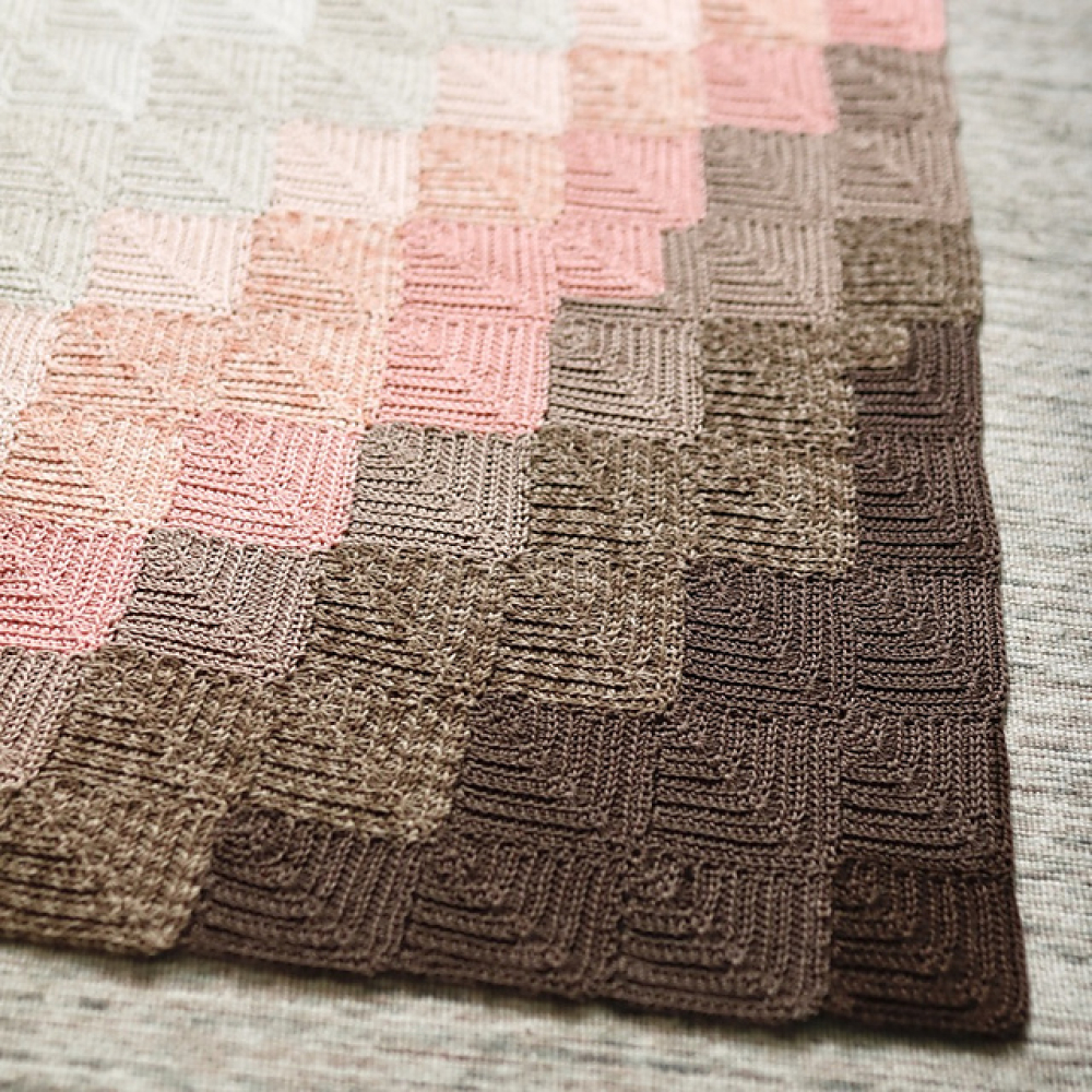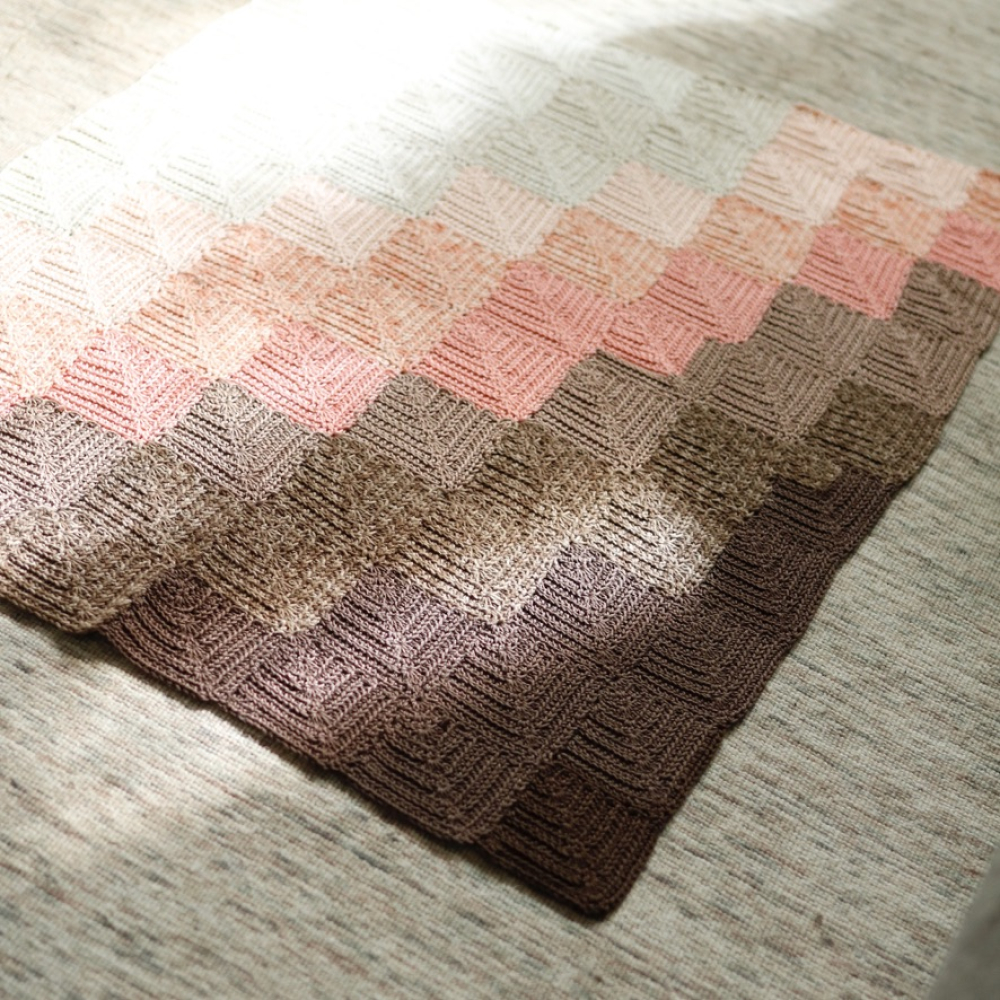 Je begint in de hoek met slalommen en kunt zo gaandeweg bepalen hoe groot de deken wordt, hiervoor vindt je ook uitgebreide tips en informatie in het patroon. Je kunt de deken dus ook met allerlei verschillende garens en bijpassende haaknaald haken.