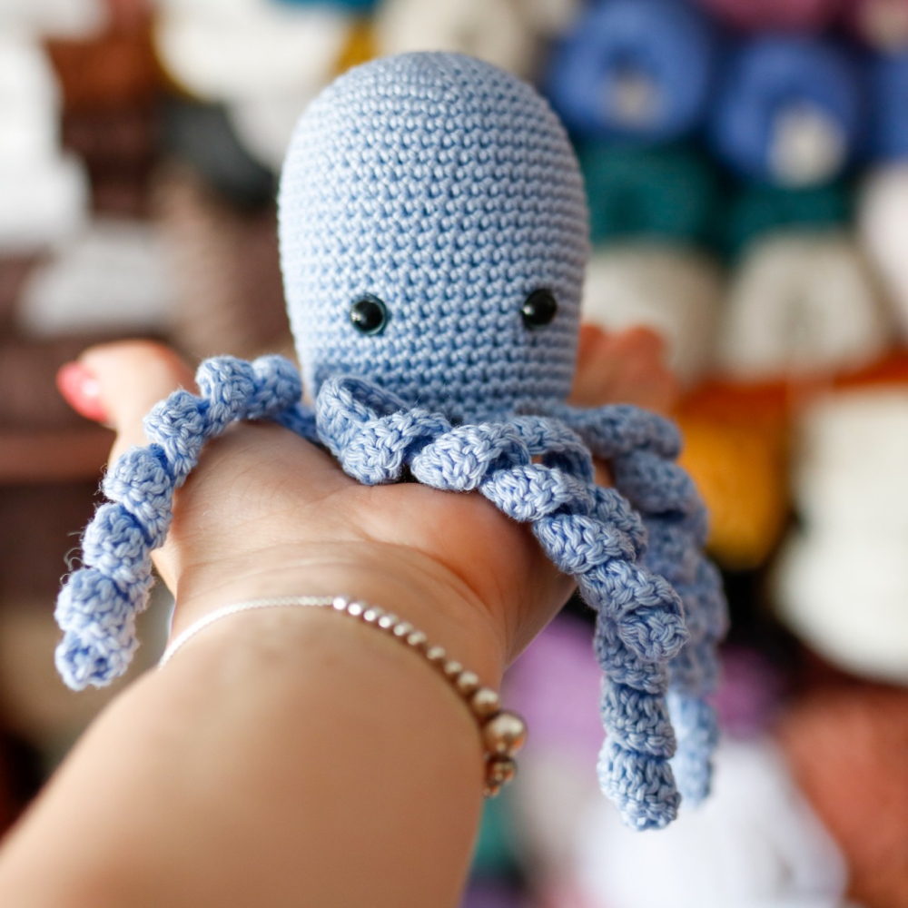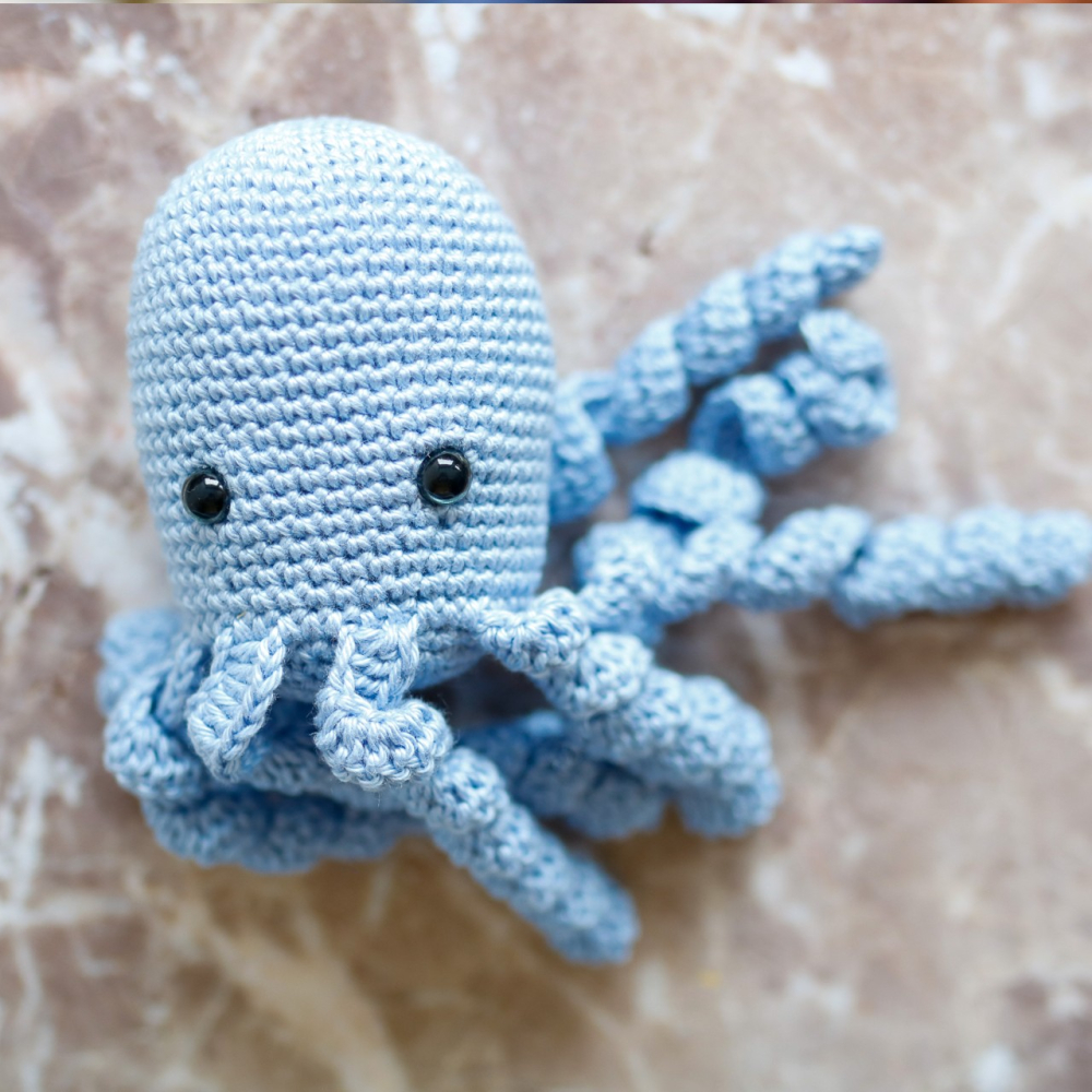- Je kunt zelf kiezen of je de octopus een gezichtje wilt geven. Hiervoor heb je eventueel dun garen nodig om de oogjes en mond te borduren of je kunt veiligheidsoogjes 8mm gebruiken.