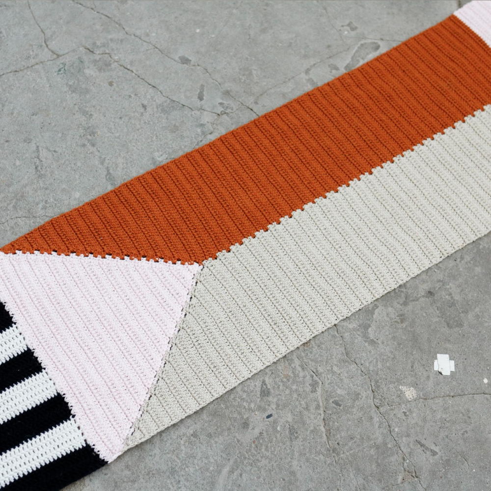 Voorbeeld 3: 1 bol per kleur: 2214 Cayenne, 2212 Linen, 203 Light Pink, 325 Black en 326 Ivory. Voor een langere sjaal neem je 2 bollen van de laatste kleur. - Haaknaald 3 mm