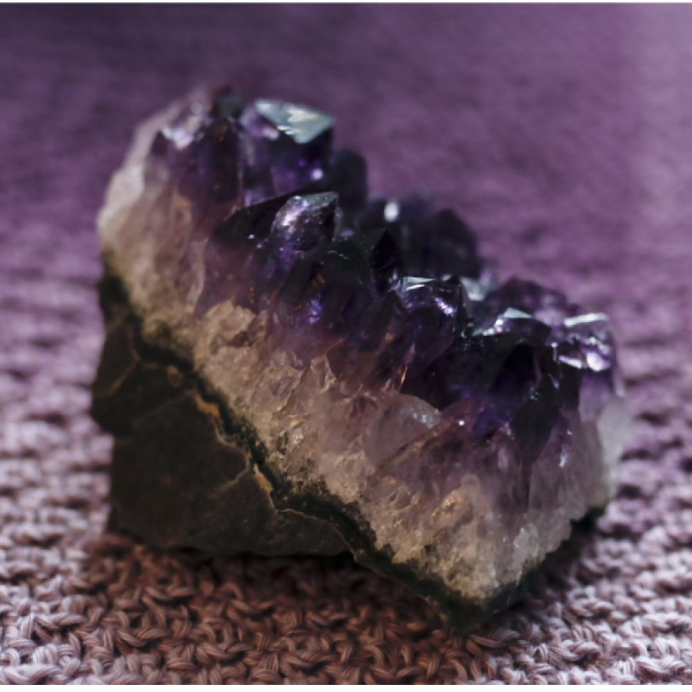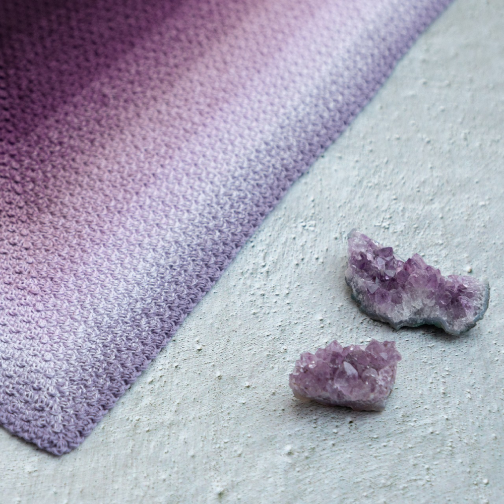 De mooie textuur van deze paarse sjaal deed mij denken aan het ruwe oppervlak van een amethist steen. Kies je andere kleuren, dan lijkt jouw sjaal misschien op een andere edelsteen, zoals een roze rozenkwarts, witte bergkristal of blauwe celestien? Deze mooie sjaal is een genot om heerlijk gedachteloos te haken.