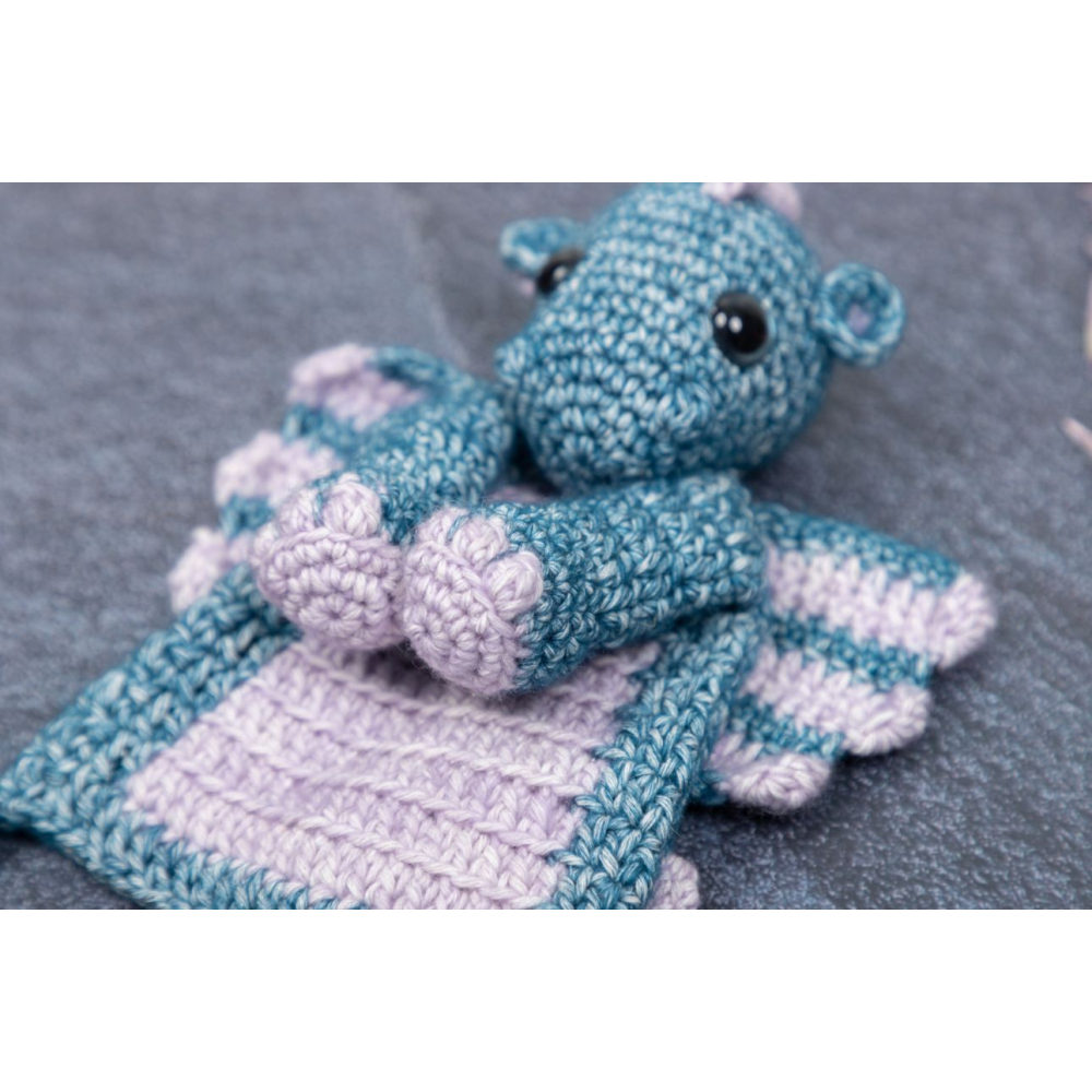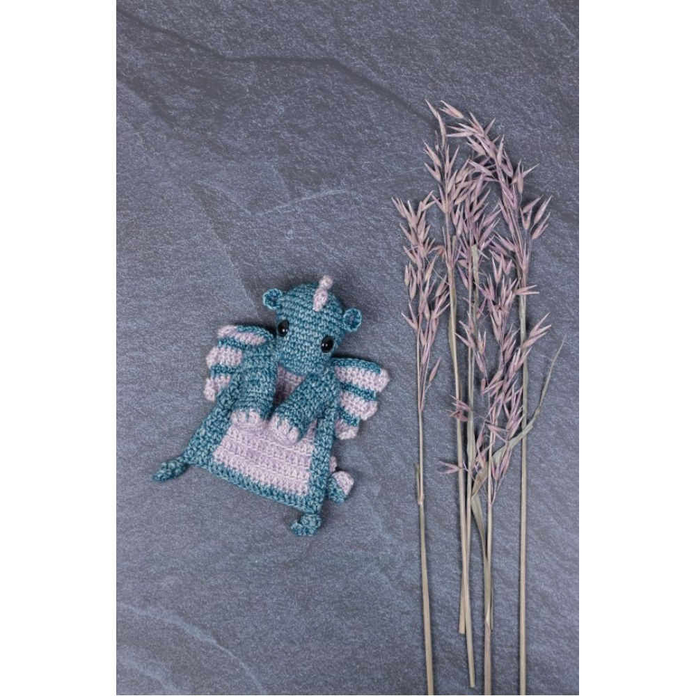 Voor de draak lappenpop: Garen voor nld 3-4mm, ik gebruikte Scheepjes Stone Washed, in donkerblauw (Blue Apatite 805: 120m) en lila (Lilac Quartz 818: 70m). Blauw met zwarte veiligheidsoogjes 12mm