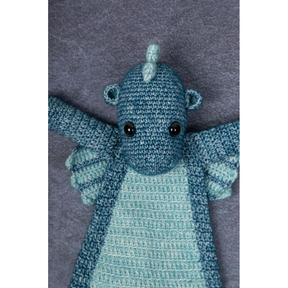 Voor de draak lappenpop: Garen voor nld 3-4mm, ik gebruikte Scheepjes Stone Washed, in donkerblauw (Blue Apatite 805: 170m) en lichtblauw (Amazonite 813: 110m). Blauw met zwarte veiligheidsoogjes 15mm