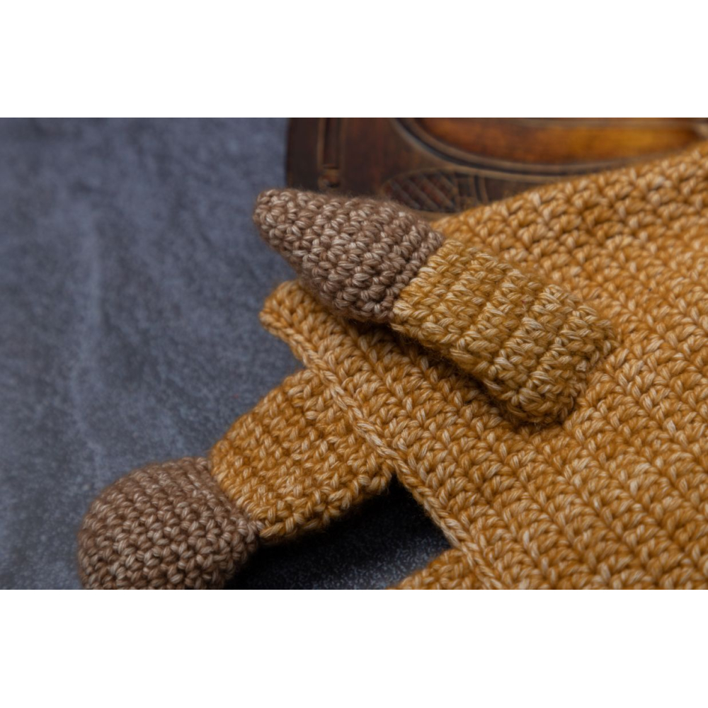 -Garen: Garen voor nld 3-4mm, ik gebruikte Scheepjes Stone Washed in geel (Yellow Jasper 809: 150m), bruin (Boulder Opal 804: 100m) en zwart (Black Onyx 803: 20m)