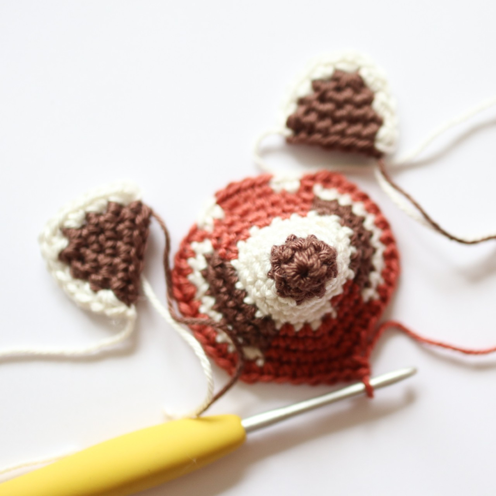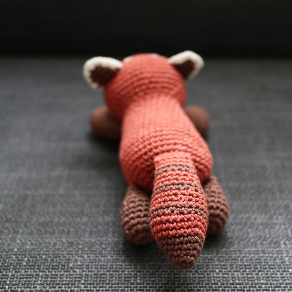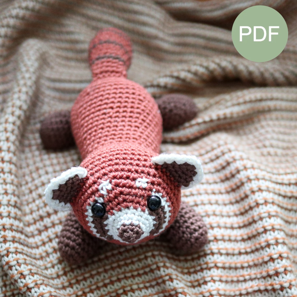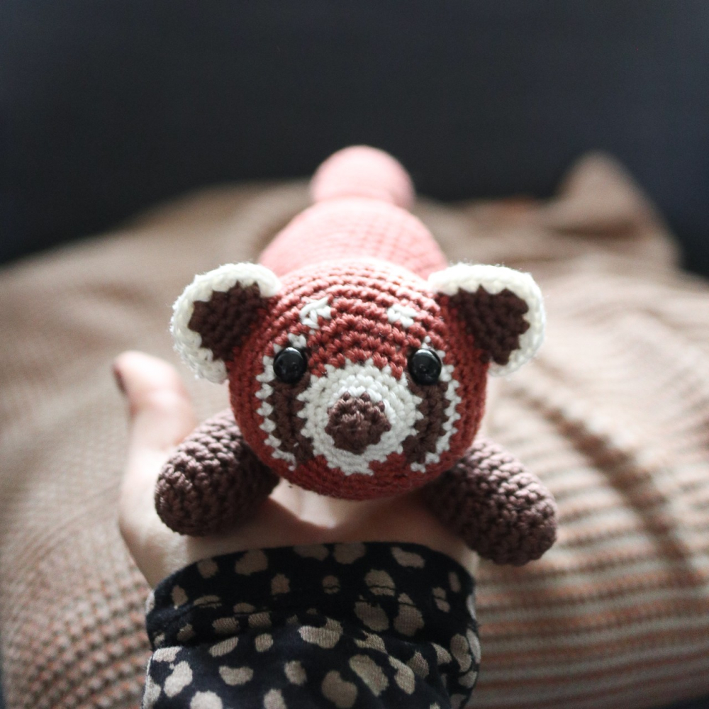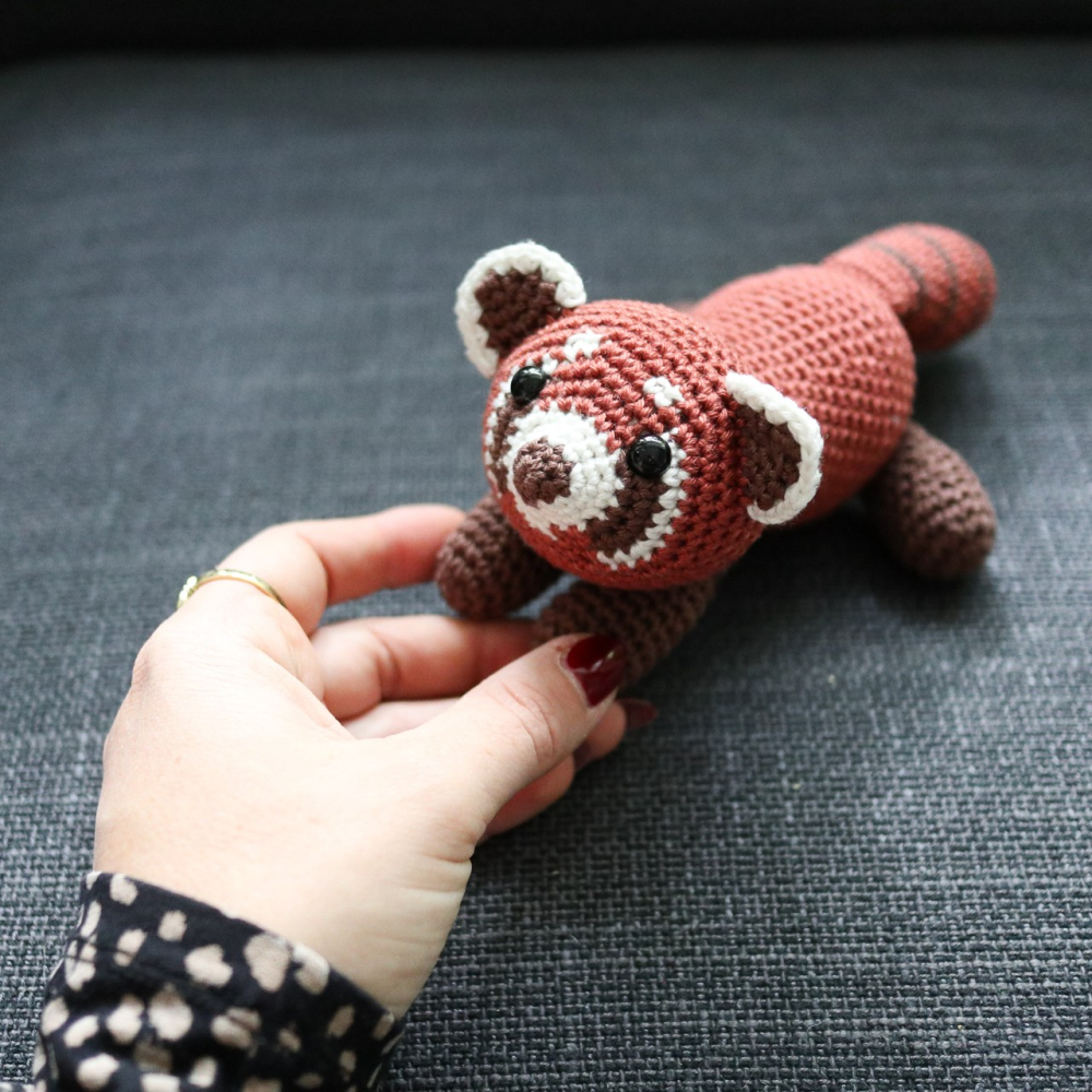 - Voor de rode panda (±20 cm inclusief staart): Garen voor nld 2,5 - 3,5 mm. Ik gebruikte Durable Coral (1 bol van 125 m/50 g is genoeg voor elke kleur) in: rood #2207 Ginger, donkerbruin #Chocolate 2229 en wit #326 Ivory.