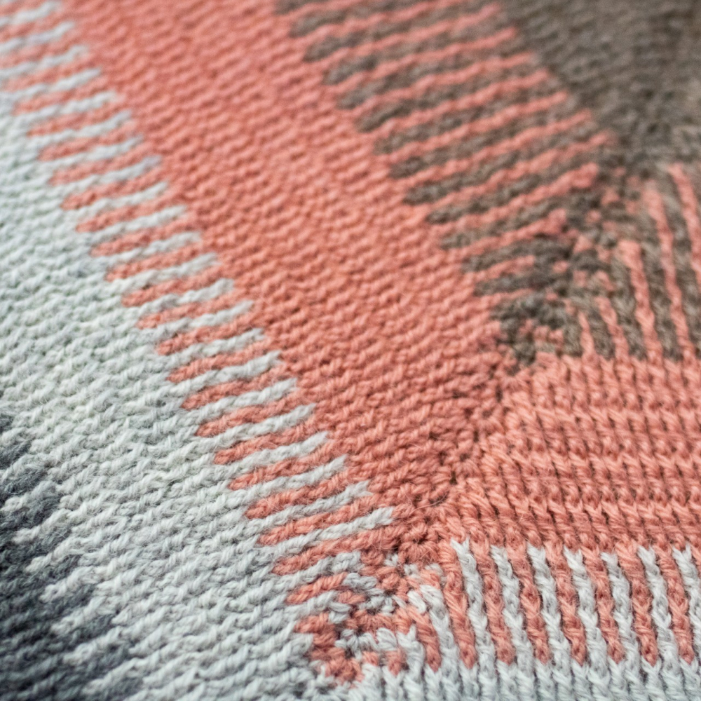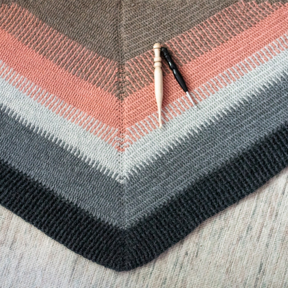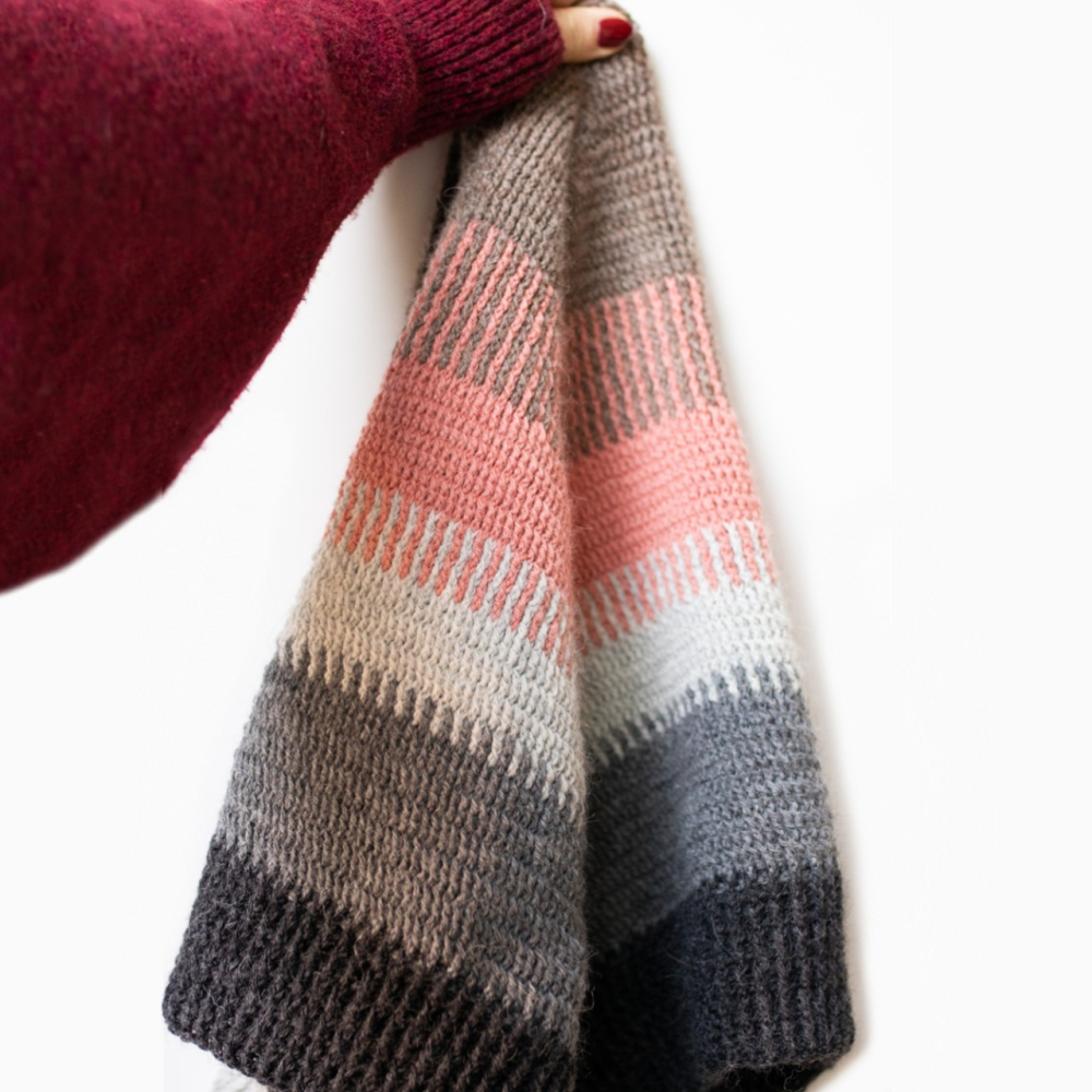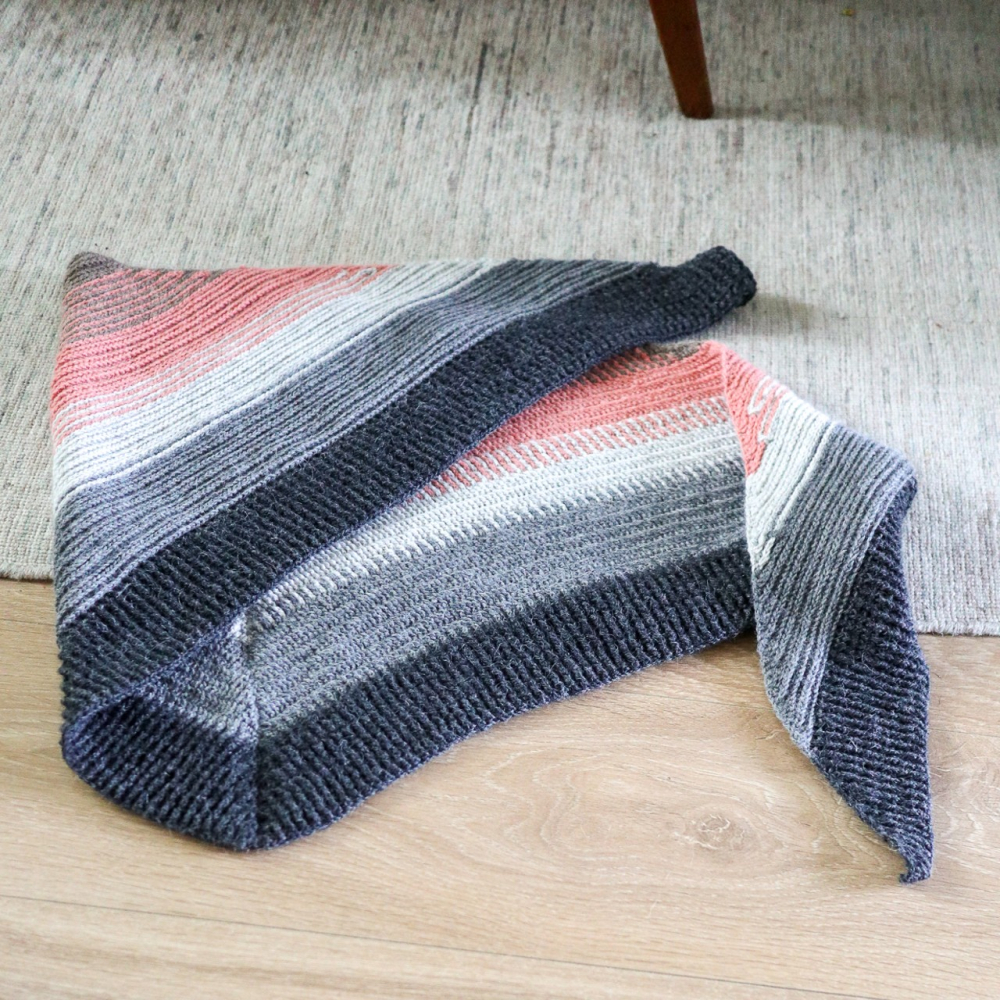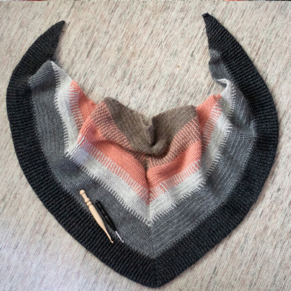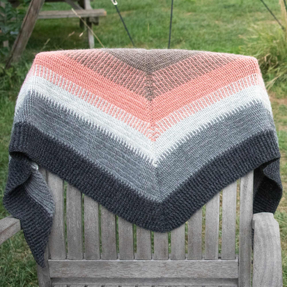 Deze driehoekige sjaal is gehaakt met reliefstokjes. Door de speciale techniek lijkt het patroon bijna op een gebreide brioche steek. De heerlijke textuur draagt ontzettend comfortabel en is bovendien zowel aan de voor- als achterkant prachtig om te zien.