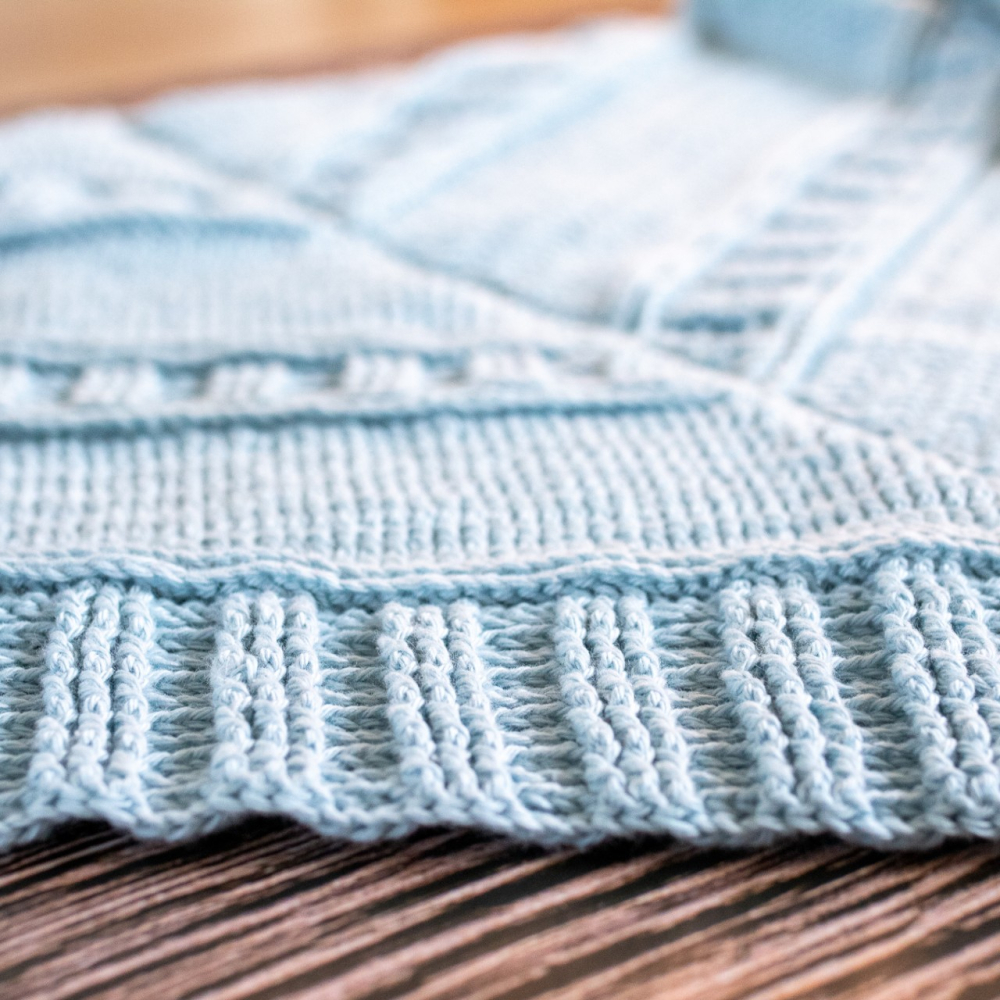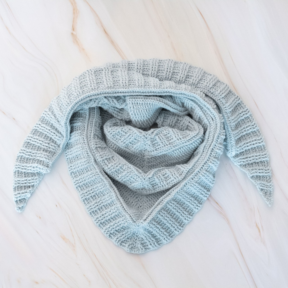 - Voorbeeld 2: ik gebruikte 5 bollen Scheepjes Organicon (170 m/ 50 g), kleur: #216 Soft Sky.