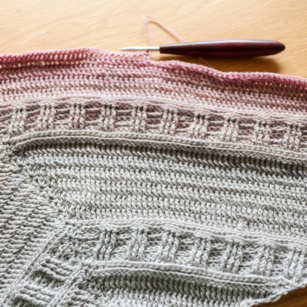 De Tempel sjaal is een gehaakte sjaal met een gebreide look. De combinatie's van verschillende reliëfstokjes gaven mij de associatie met een statig bouwwerk, vandaar de naam Tempel Sjaal.