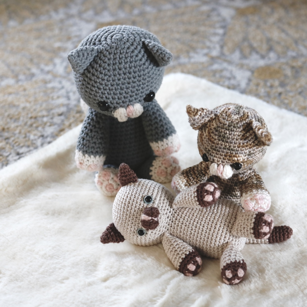 - Voor de grote poes (±18cm): Garen voor nld 3,5-4,5mm. Ik gebruikte Durable Cosyfine (1 bol van 105m/50g is genoeg voor elke kleur) in: donkergrijs: #2235 Ash, wit: #326 Ivory en een klein restje roze garen