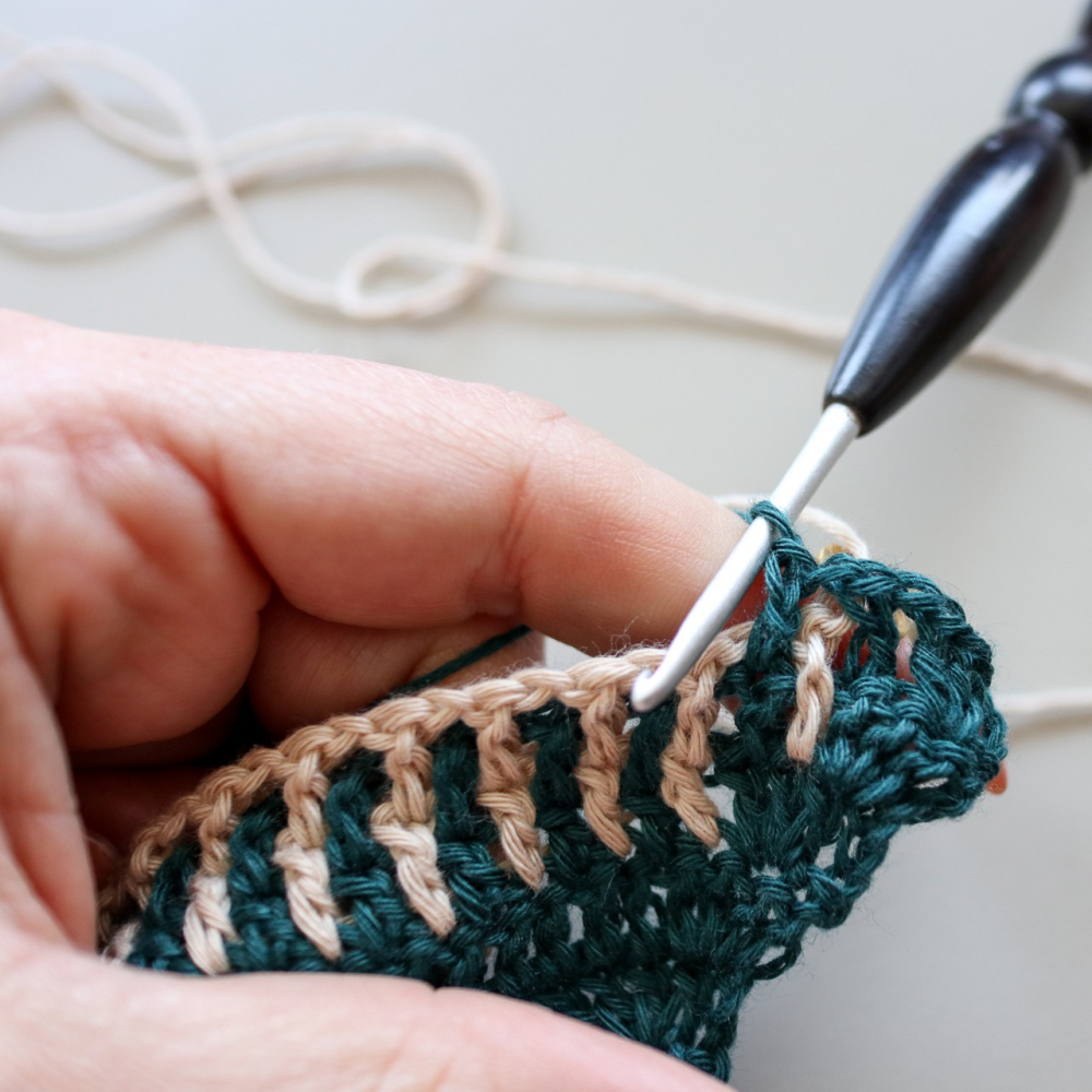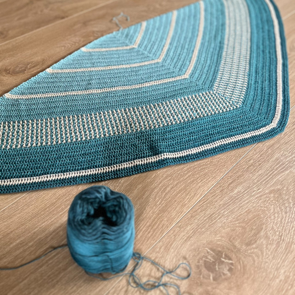 - Voorbeeld 2: ik gebruikte 1 bol Scheepjes Whirl (1000 m/ 215 g), kleur: #562 Petrol Please Me en 1 bol Scheepjes Whirlette (455 m/ 100 g), kleur: #886 Almond Butter.