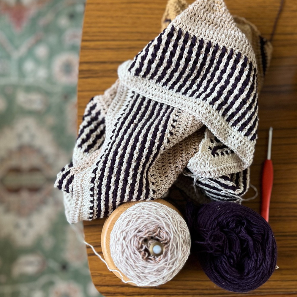 - Voorbeeld 1: ik gebruikte 1 bol Scheepjes Whirl (1000 m/ 215 g), kleur: #756 Caramel Core Blimey en 1 bol Scheepjes Whirlette (455 m/ 100 g), kleur: #855 Grappa.