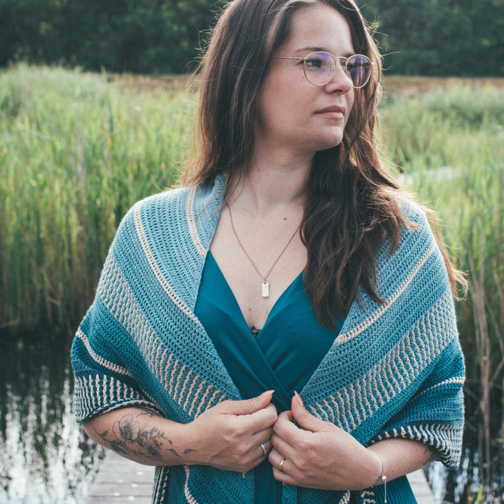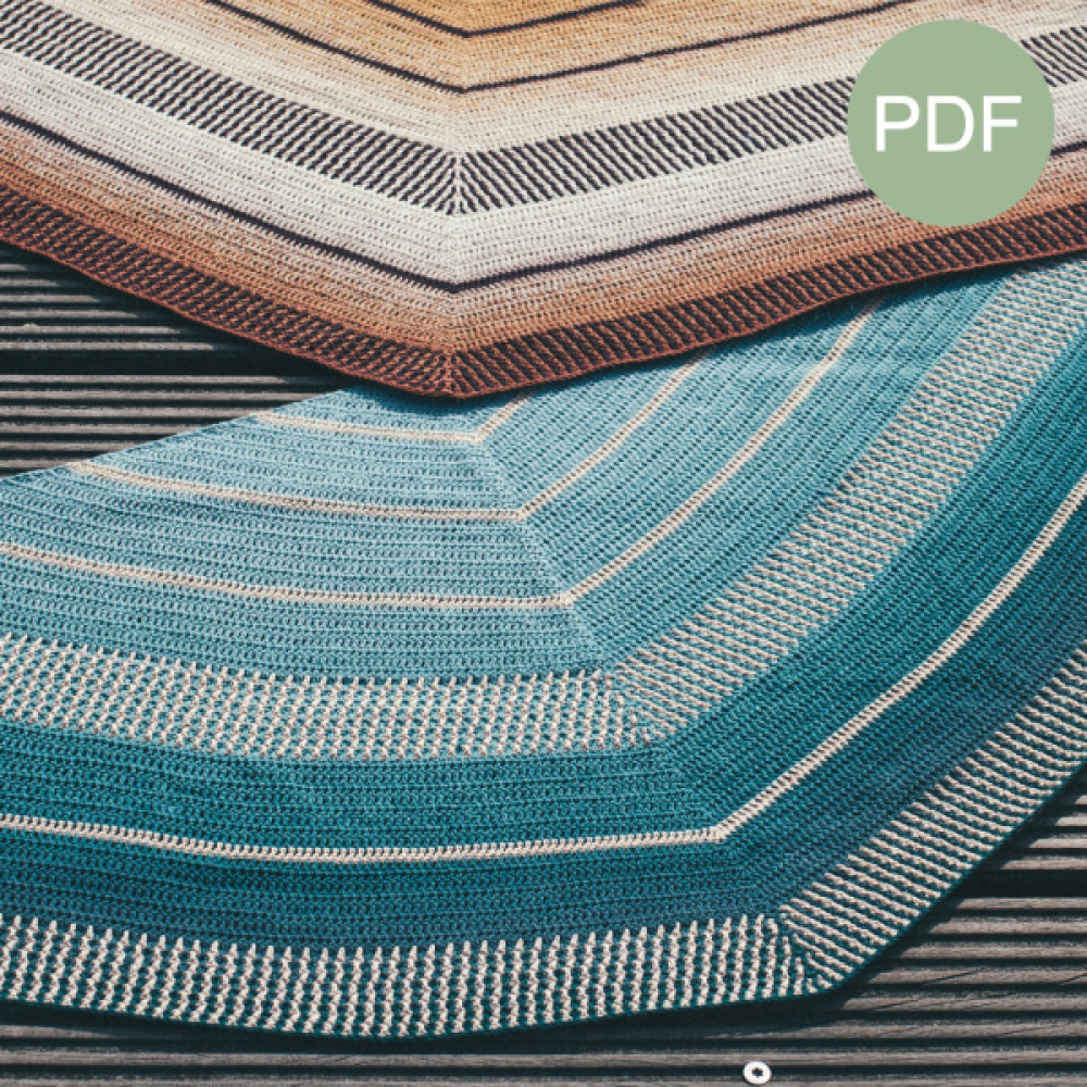 Deze sjaal bestaat eigenlijk alleen uit rechte lijnen, maar de bijzondere plaatsing in combinatie met het kleurverloop in het garen zorgt voor een beeldschoon uiterlijk.