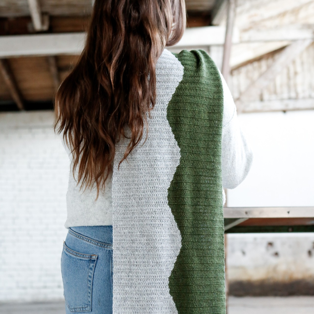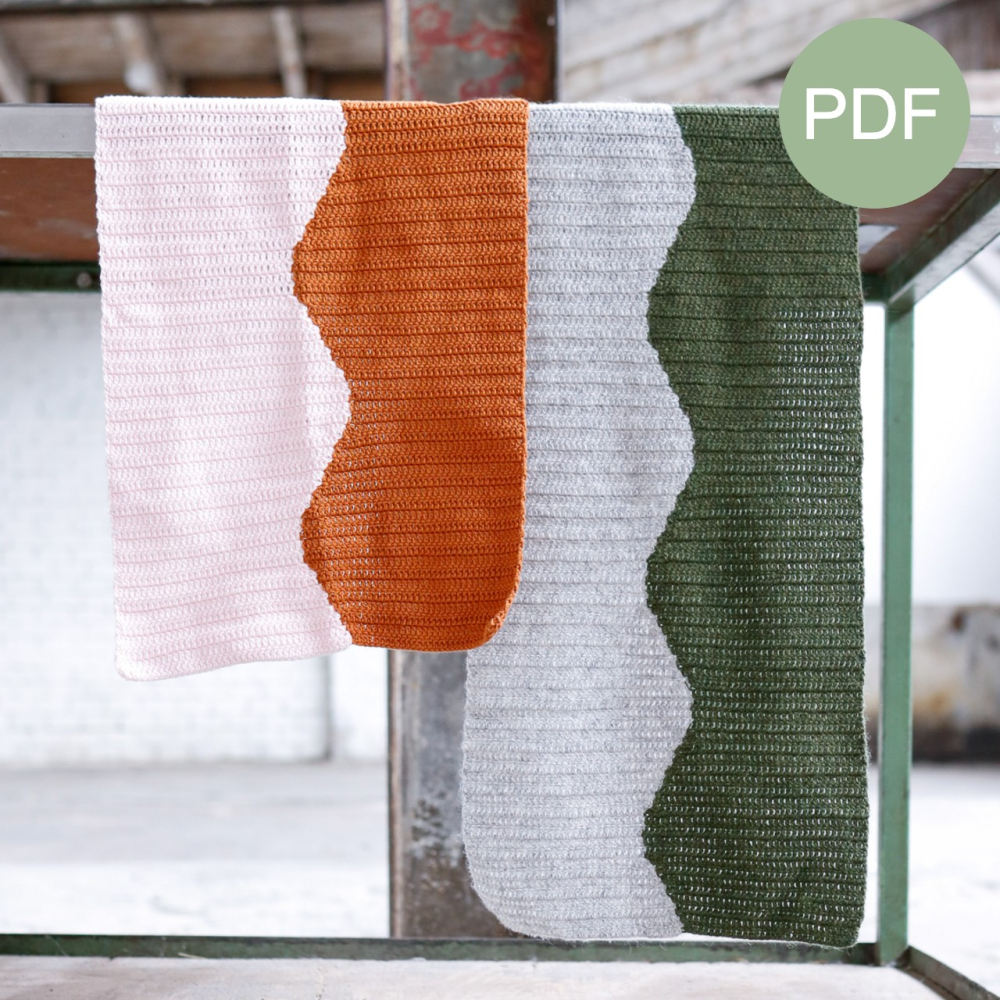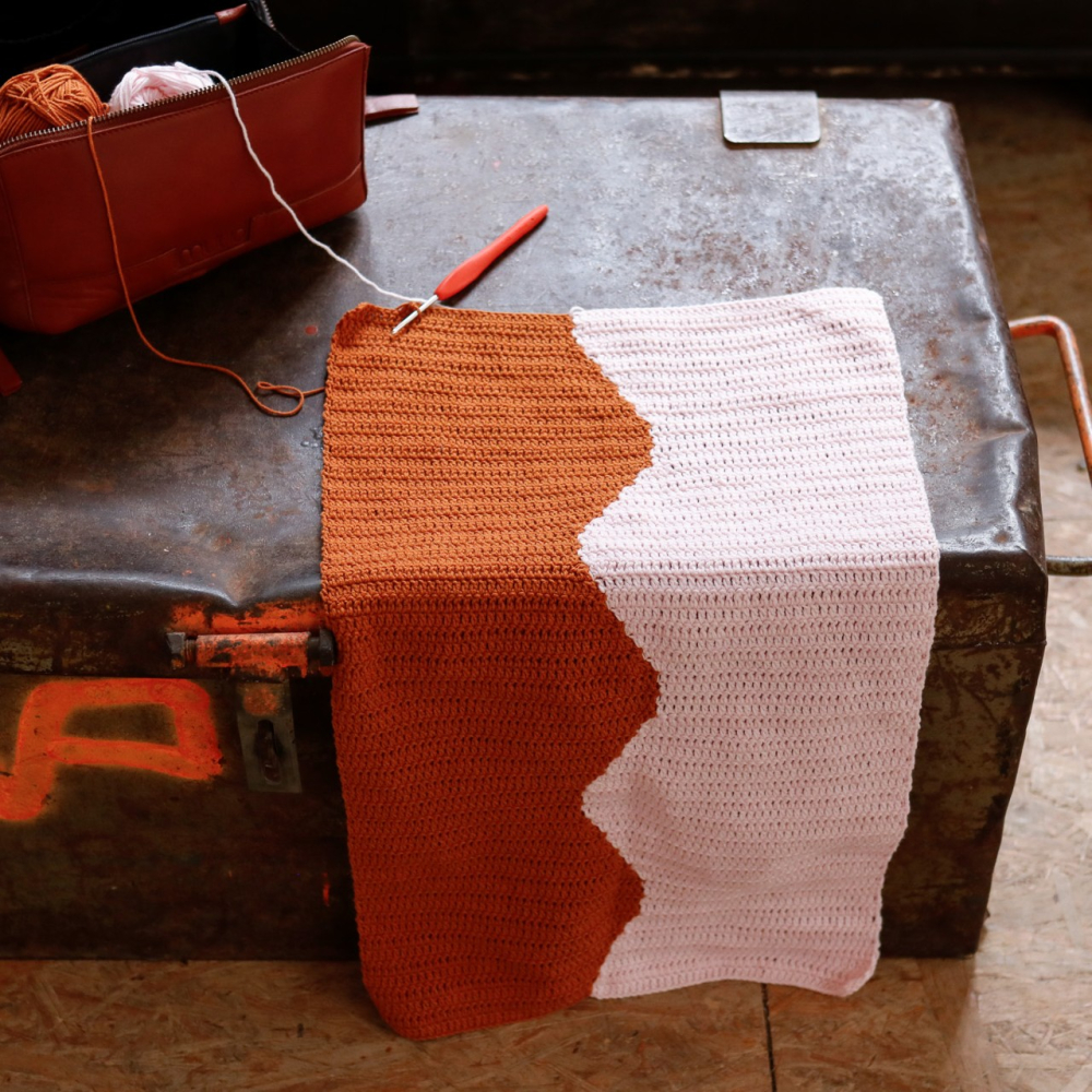 Dit is de Retro Sjaal, een speels en stijlvol haakproject met een knipoog naar vroeger. De sjaal bestaat uit twee vlakken met een golvende lijn in het midden. Die zachte golf geeft het ontwerp net dat beetje extra: subtiel, maar toch een echte blikvanger.