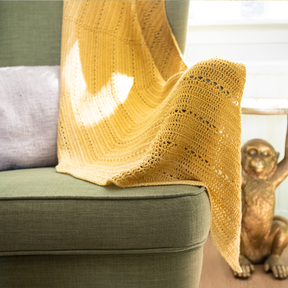 De simpele dichte basis van stokjes wordt in segmenten verdeeld door de symmetrische banen van v-steken. De halfronde vorm is ideaal om zowel als omslagdoek te gebruiken als om de hals te dragen.
