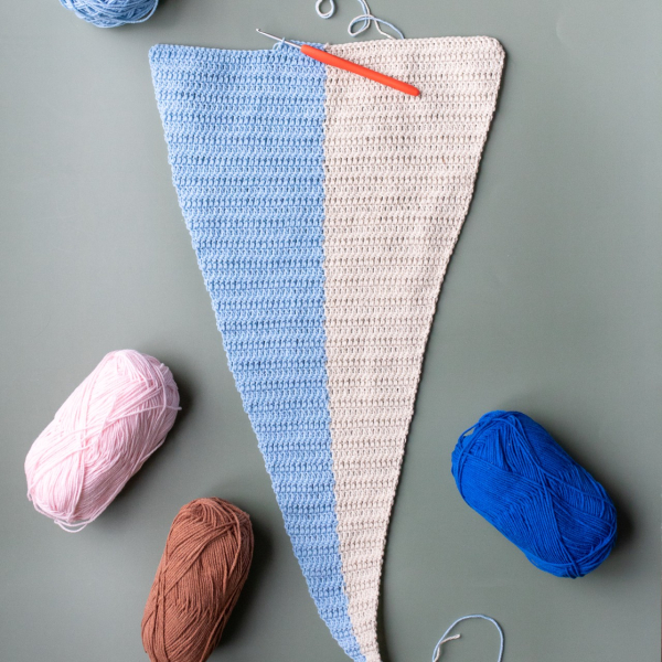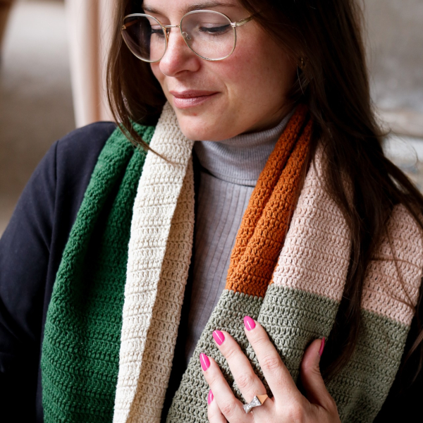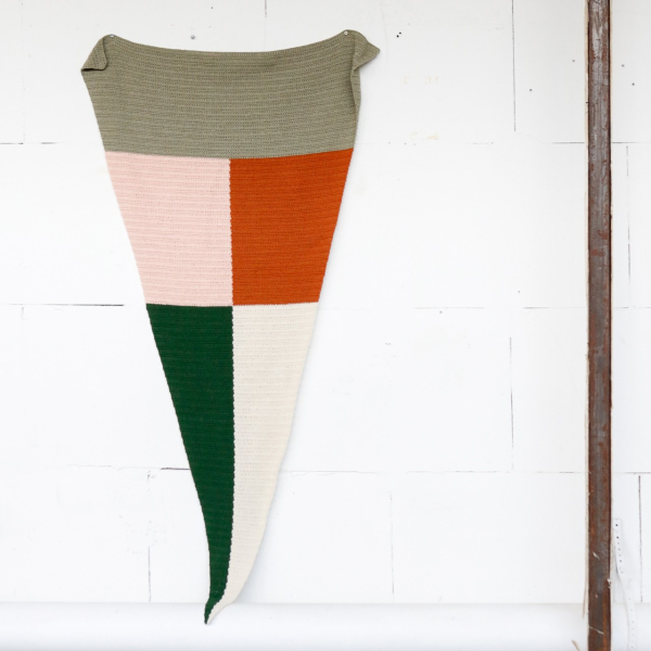 Dit ontwerp bestaat uit vlakken in verschillende kleuren die perfect op elkaar passen. Door een leuk trucje haak je steeds twee vlakken tegelijkertijd. Je kunt eindeloos varieren met de kleuren, maar ook bijvoorbeeld handgeverfd of zelfs allemaal restjes garen gebruiken. In het patroon vind je ook instrcuties voor het plannen van je sjaal met handige inkleurpagina's.