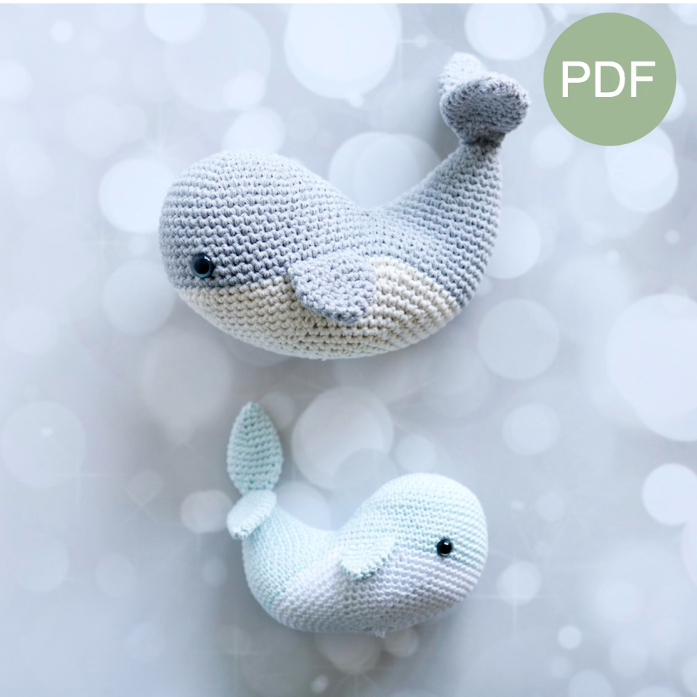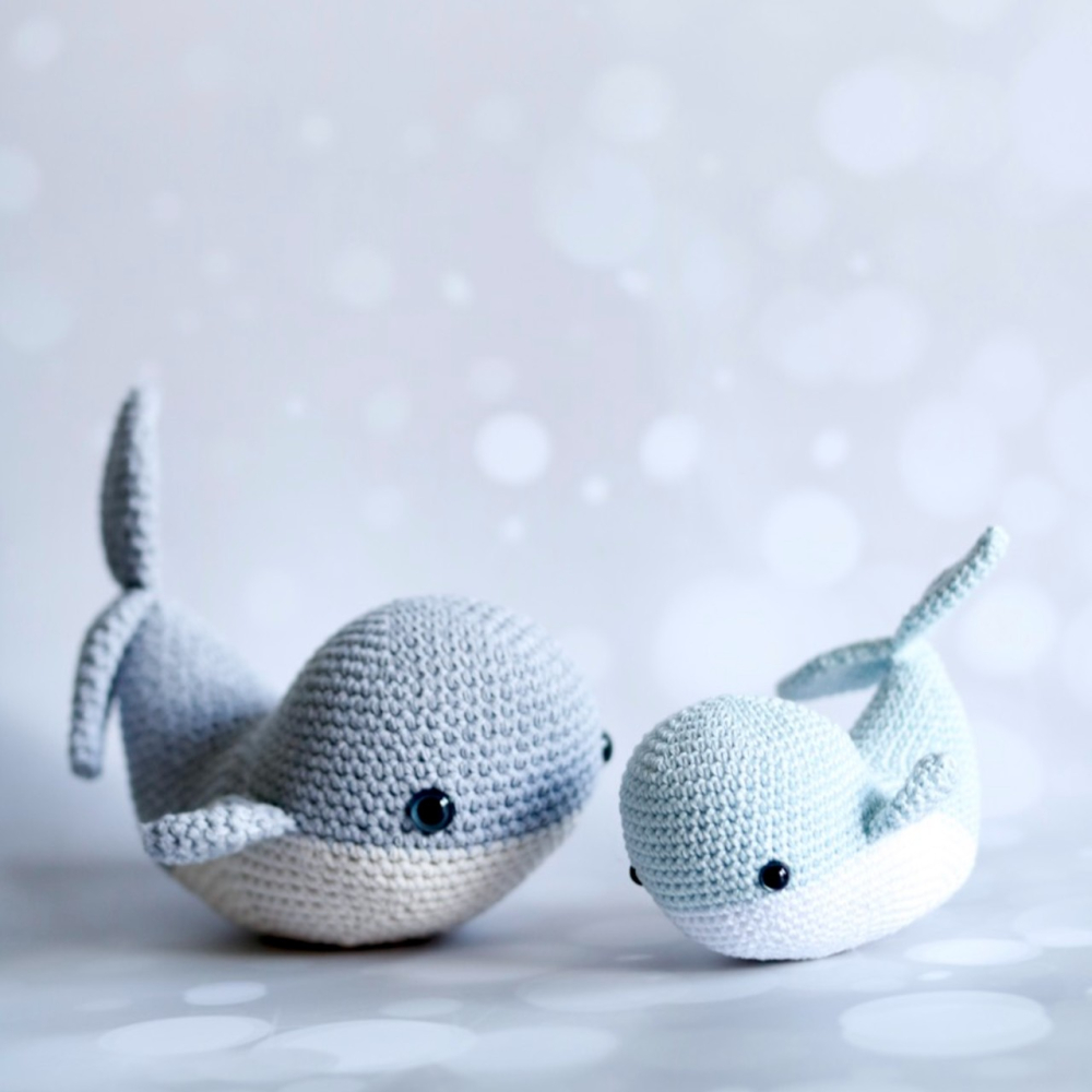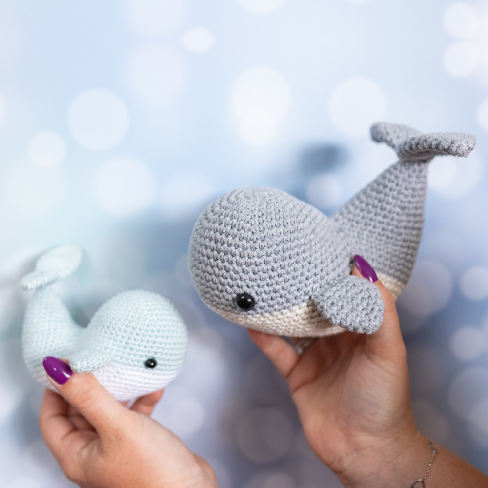 - Voor een grote walvis (±18cm lang en 10cm hoog): Garen voor nld 3,5-4,5mm. Ik gebruikte Borgo de Pazzi Amore cotton 170 (1 bol van 170m/100g is genoeg voor elke kleur) in: grijs #106 en wit #101 of blauw #107 en wit #101