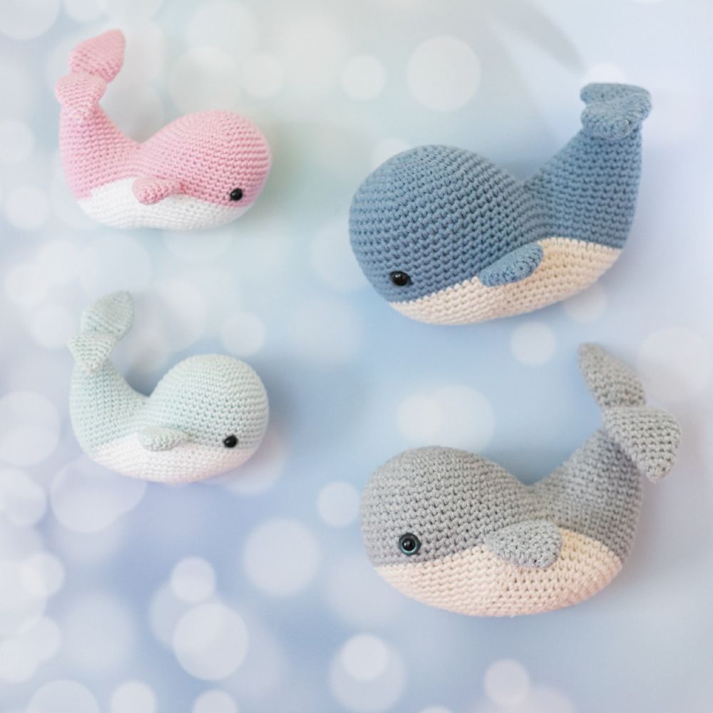 - Voor een kleine walvis (±12cm lang en 8cm hoog): Garen voor nld 2,5-3,5mm. Ik gebruikte Scheepjes Catona (1 bol van 125m/50g is genoeg voor elke kleur) in: blauw #509 Baby blue en wit #106 Snow white of roze #246 Icy pink en wit #106 Snow white